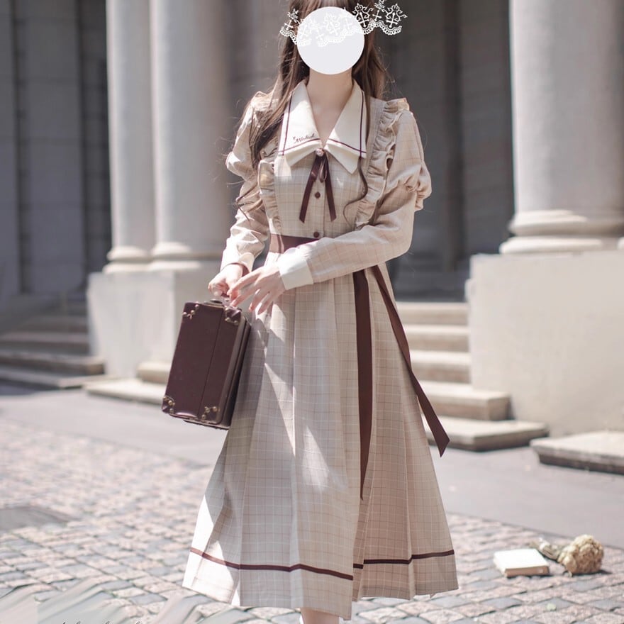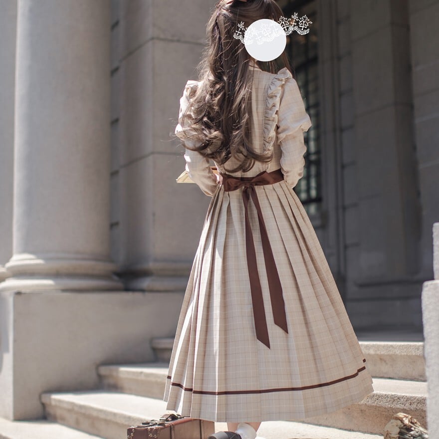 淡いベージュ系のチェック柄の生地に、ブラウンのラインやリボン、ウエストベルトがアクセントになった、クラシカルロリータのワンピースです。