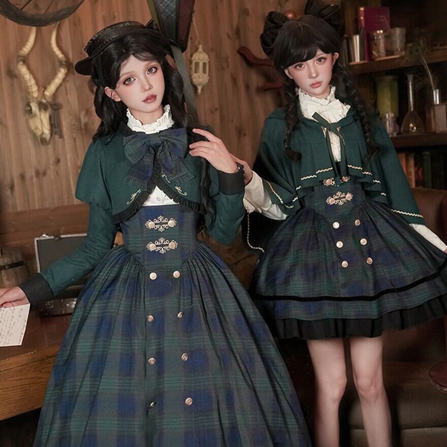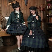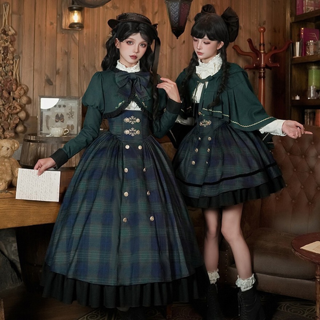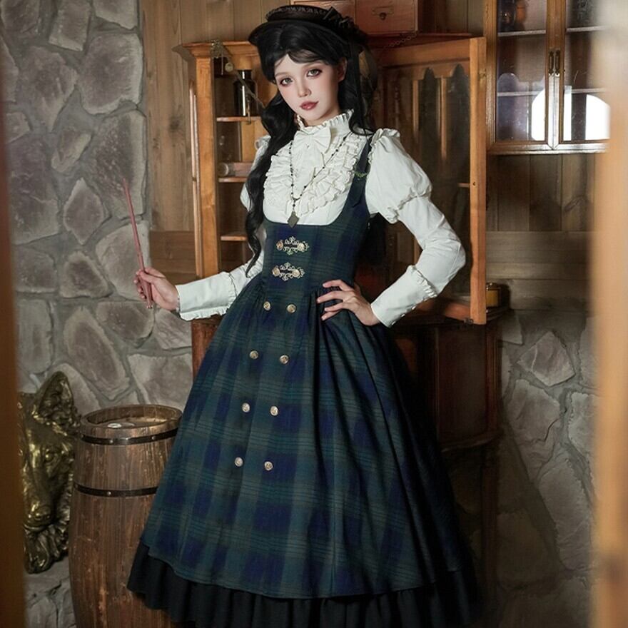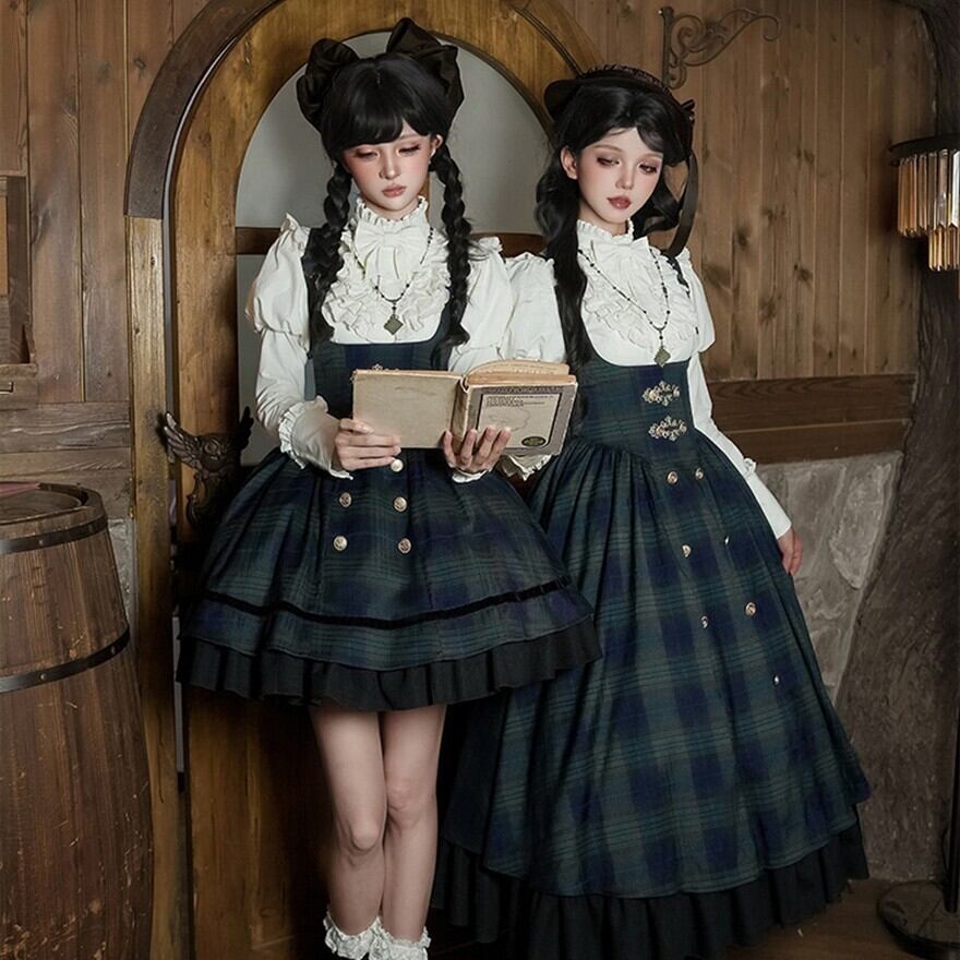 深みのあるグリーンとネイビーのチェック柄が特徴的なジャンパースカートと、フリルやパフスリーブがクラシカルな白の長袖ブラウスのセットアップです。