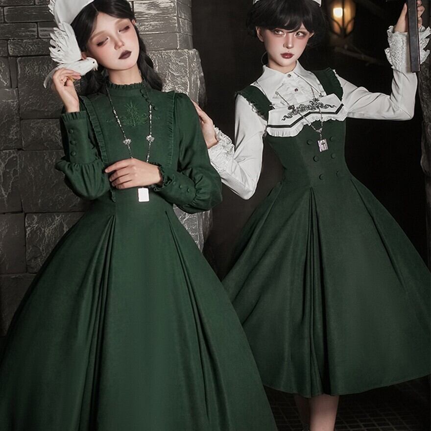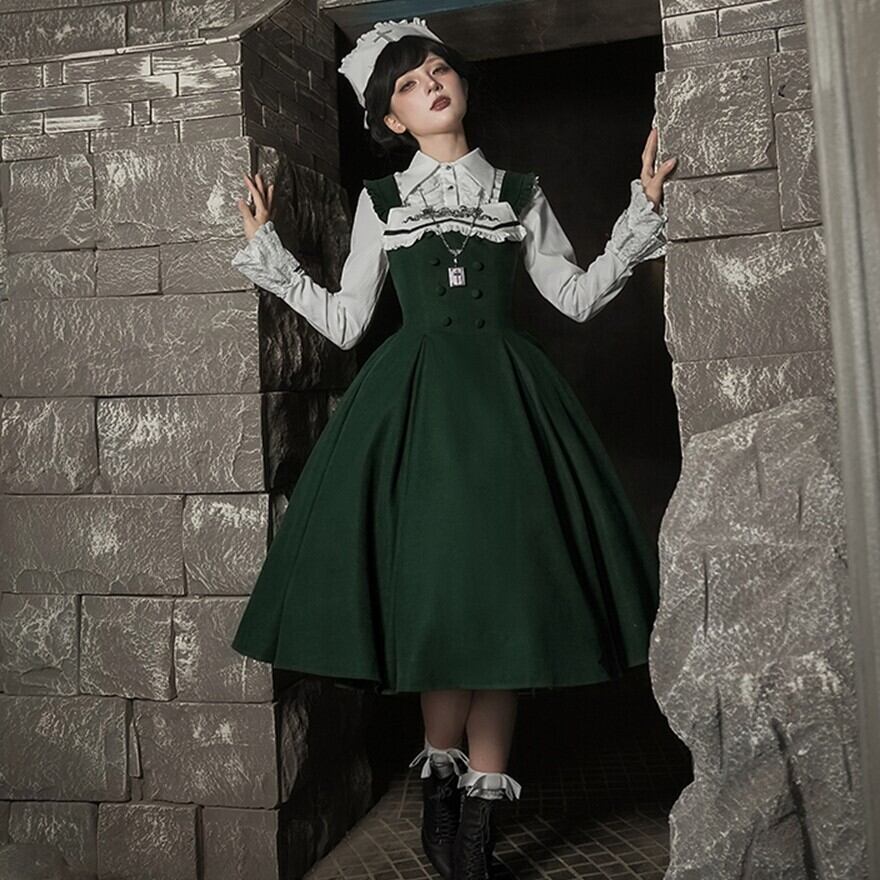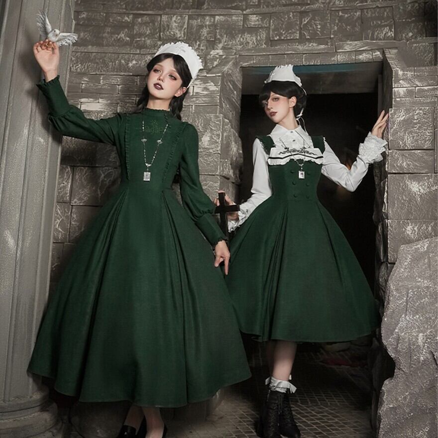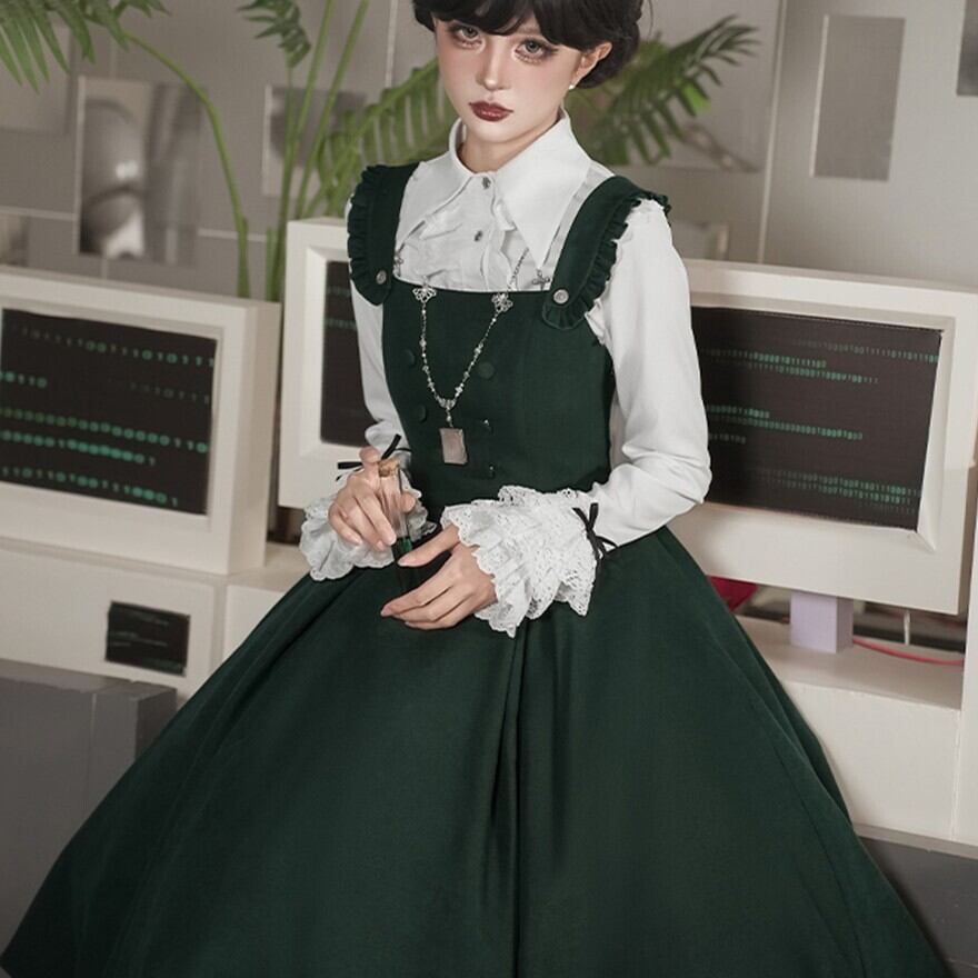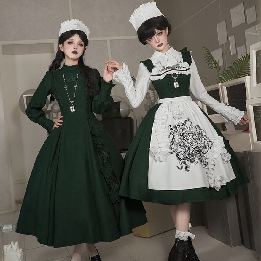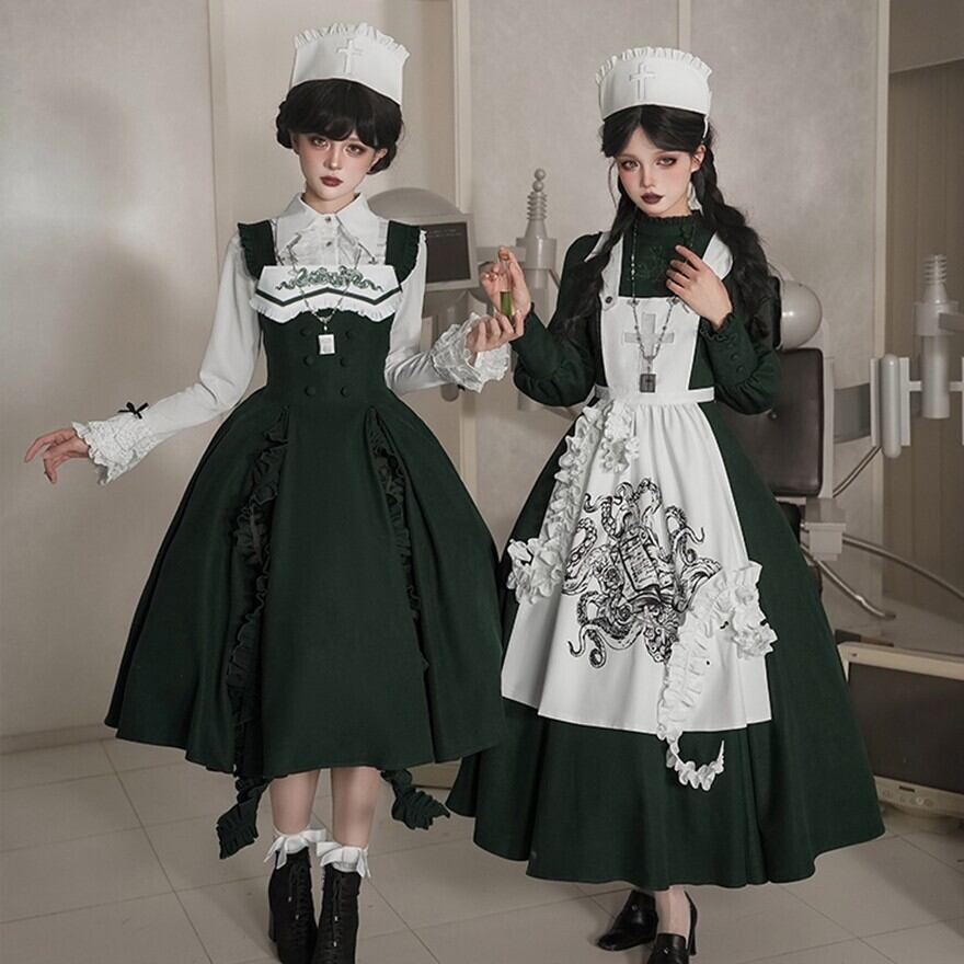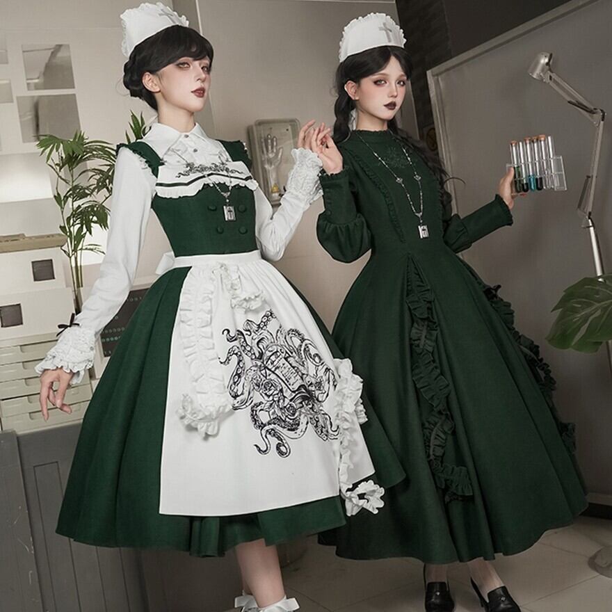 深いダークグリーンのジャンパースカートに、フリルとタコの触手のようなモチーフのプリントが施された白のエプロンを重ね、さらに長袖の白いブラウスを組み合わせた、ゴシック&クラシカルなロリータセットアップです。