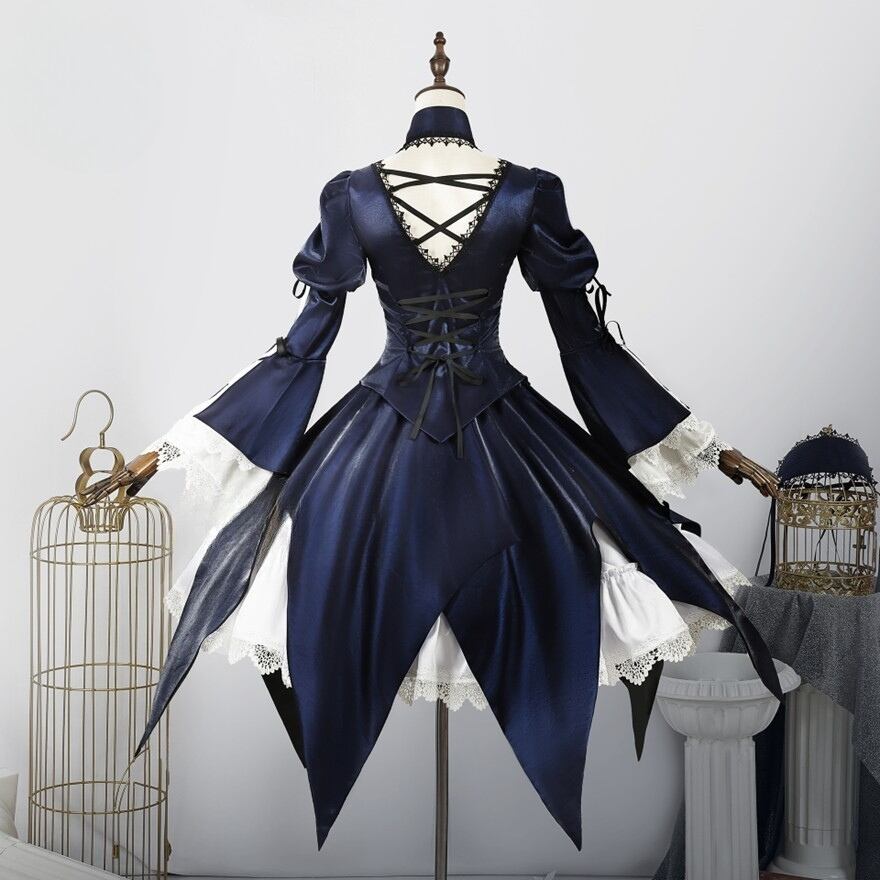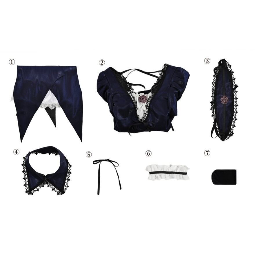ダークな色合いと光沢のあるサテン生地、そして随所にあしらわれたレースやフリルが、エレガントでありながらミステリアスな雰囲気を演出します。