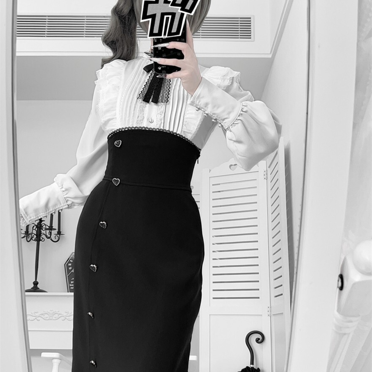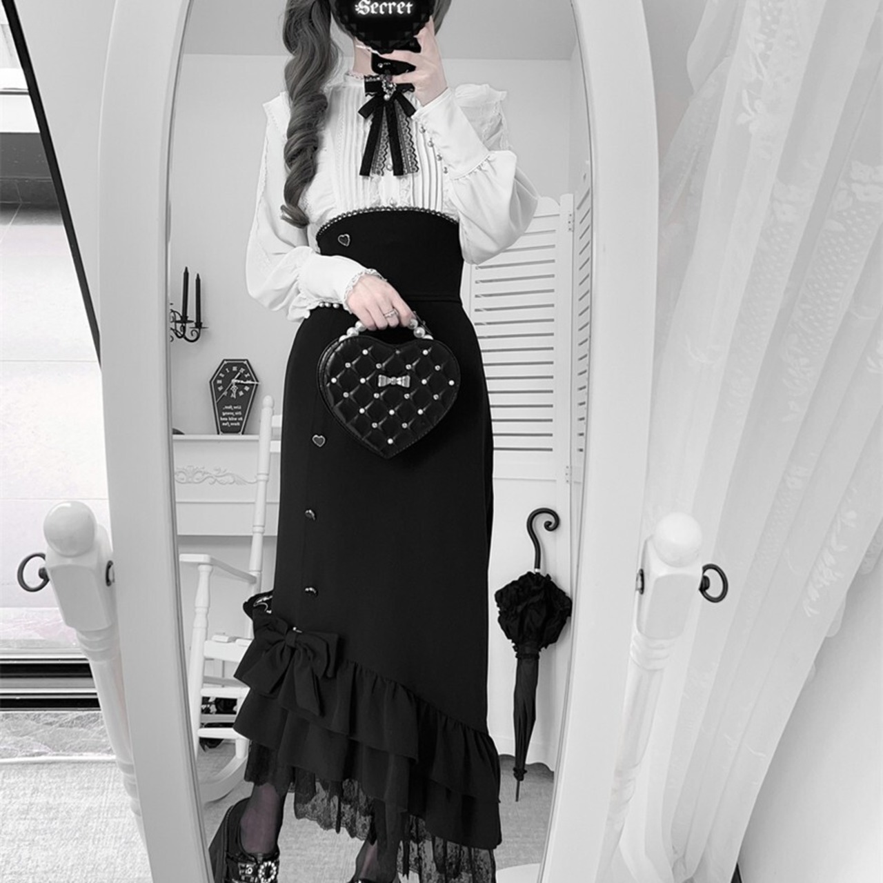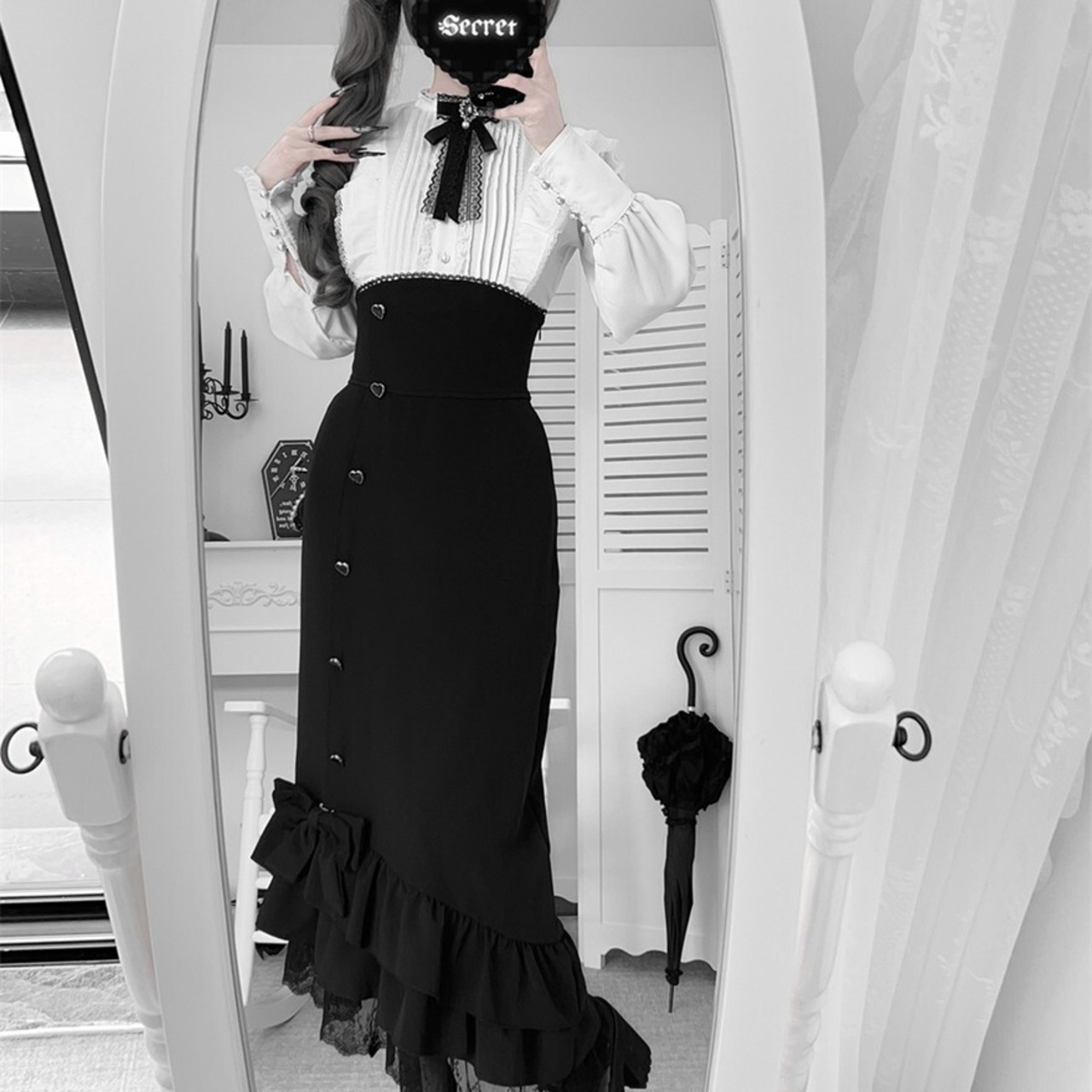関連キーワード: #ロリータ #クラロリ #ゴスロリ #セットアップ #モノトーン #フリル #レース #エレガント #シック #可愛い #ハイウエスト