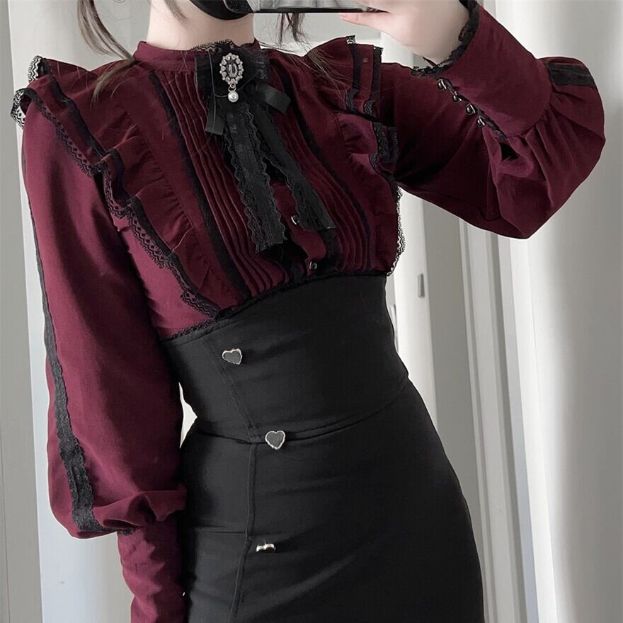 ブラウスは、オフホワイト、ボルドーの2色展開で、どちらもフリルやボウタイリボンが施されたクラシカルなデザインです。