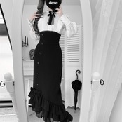 スカートはタイトなシルエットで、裾にかけてアシンメトリーなフリルとレースがあしらわれ、エレガントな中にも甘さを加えています。ハイウエストとロング丈がドレッシーな印象です。