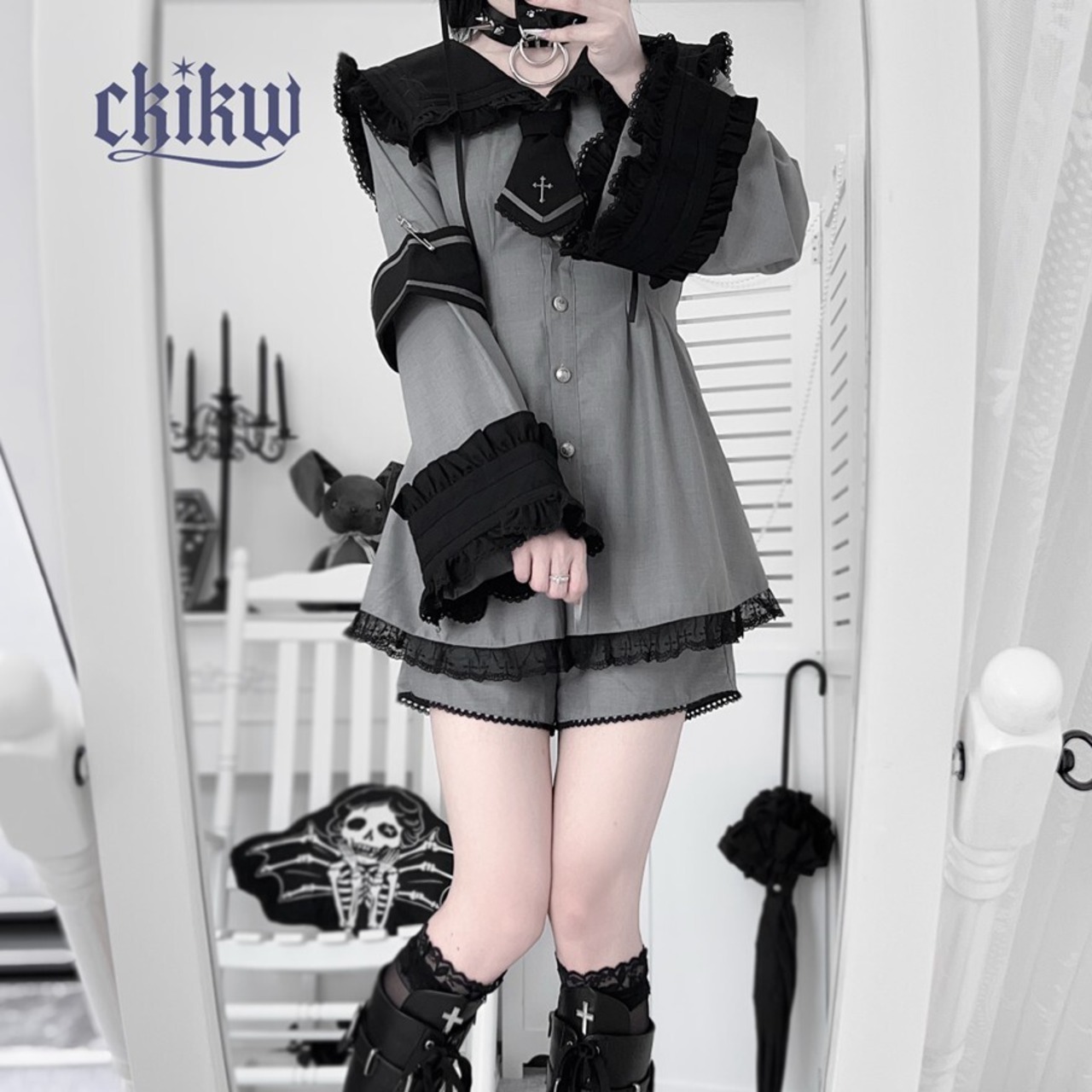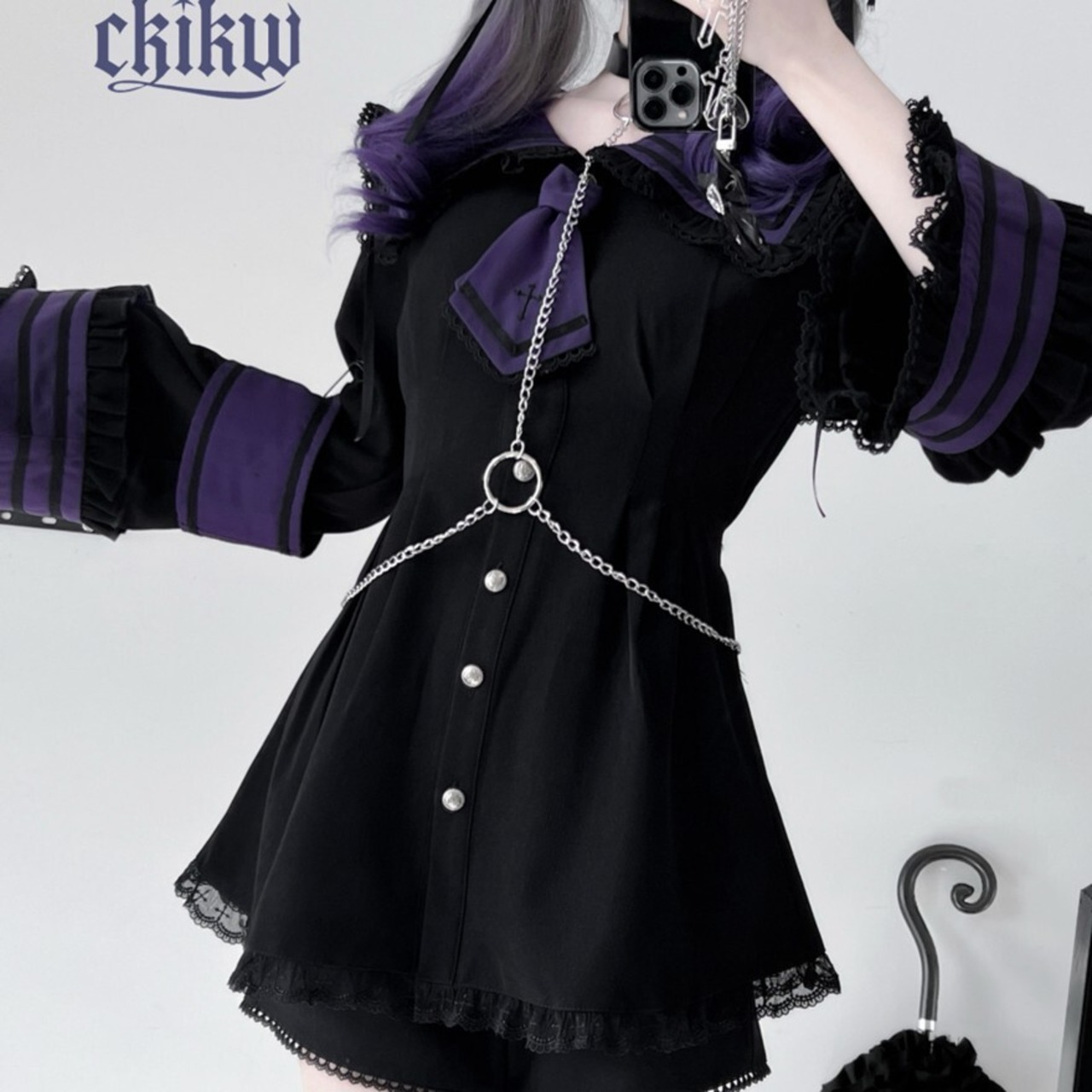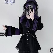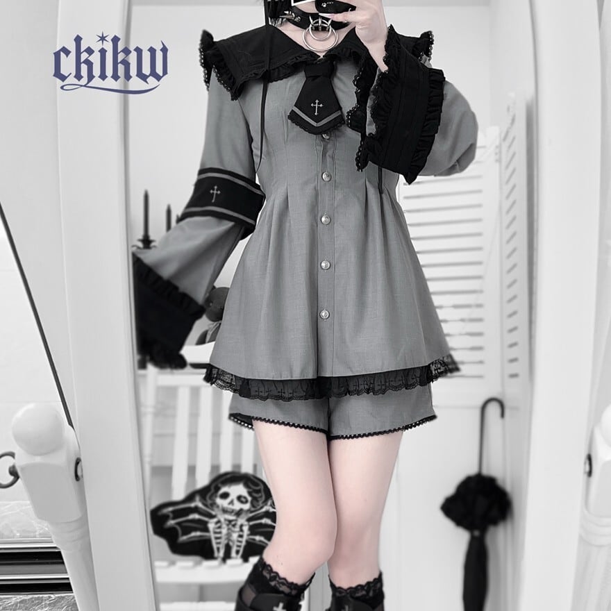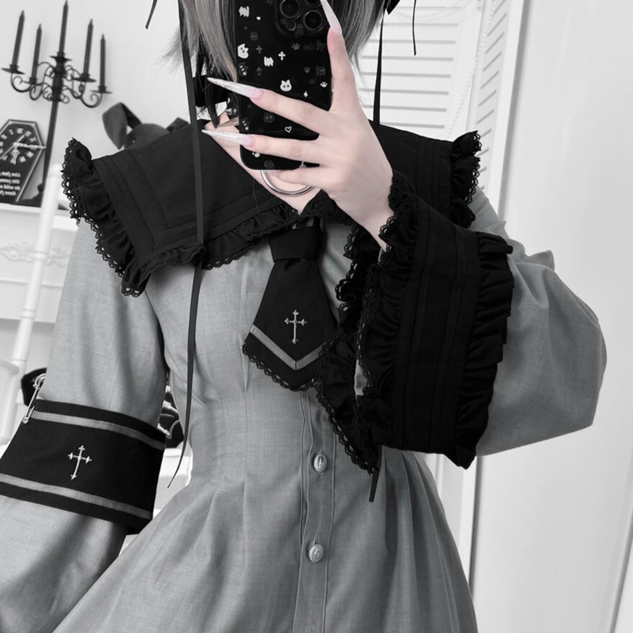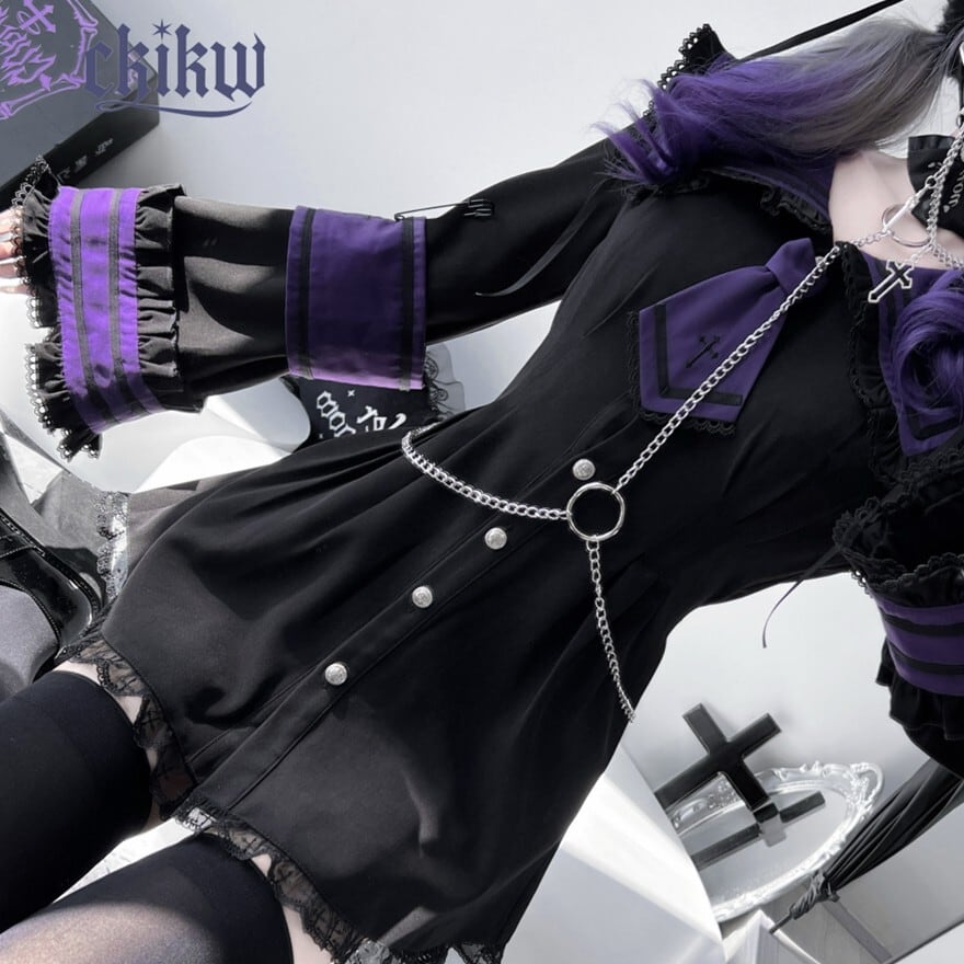 襟元のタイや、袖のラインに施されたクロスの刺繍やモチーフが、ゴシックまたはクラシカルなアクセントになっています。