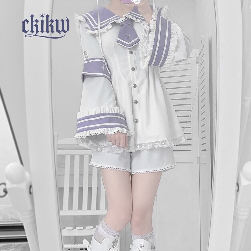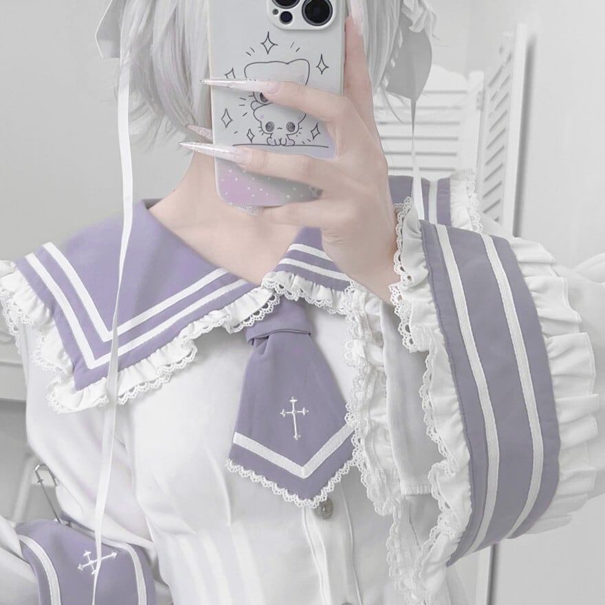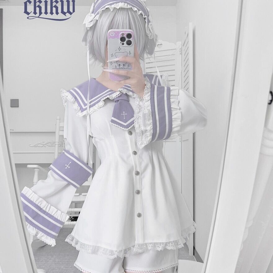 清潔感のあるセーラーデザインに、レースやフリルといった甘いディテールが加えられており、様々な雰囲気のロリータファッションに取り入れやすいアイテムです。特に、バイカラーのデザインが個性的で目を引きます。