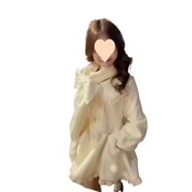 丸襟とパフスリーブが特徴的で、裾周りには繊細なレースのフリルがあしらわれています。