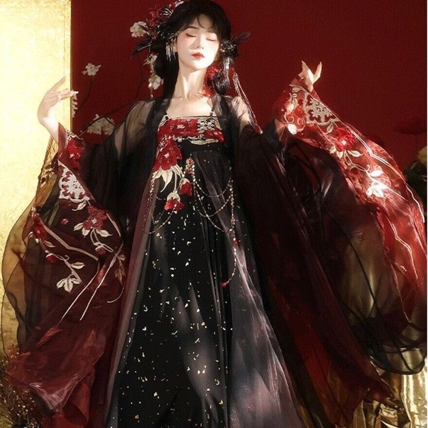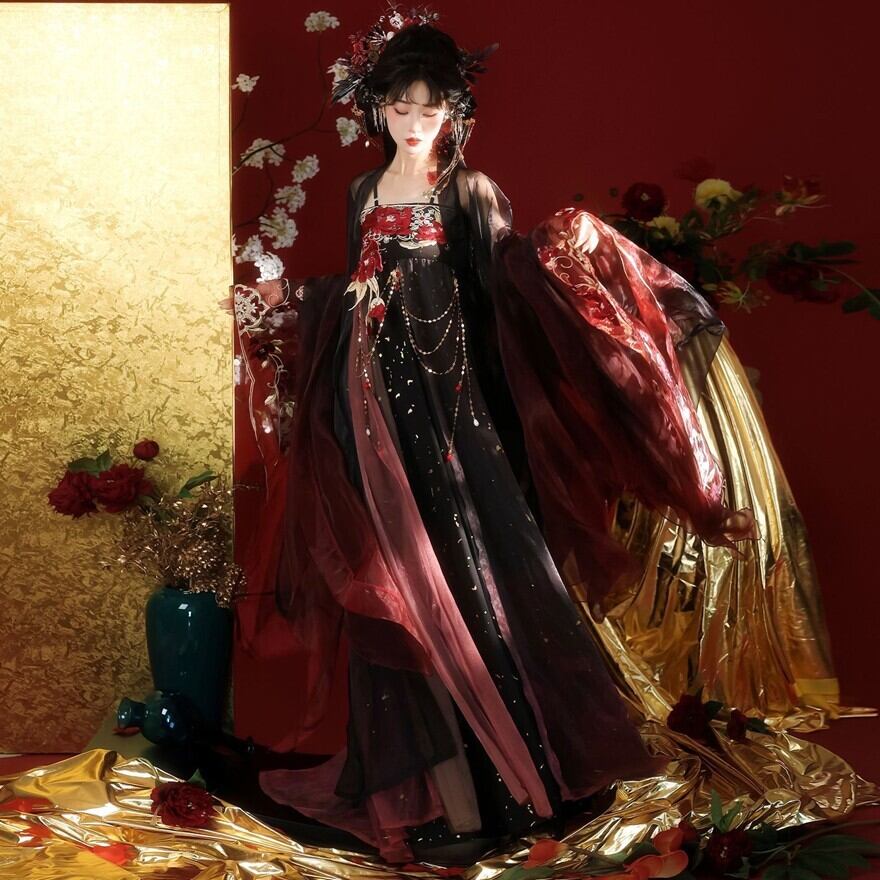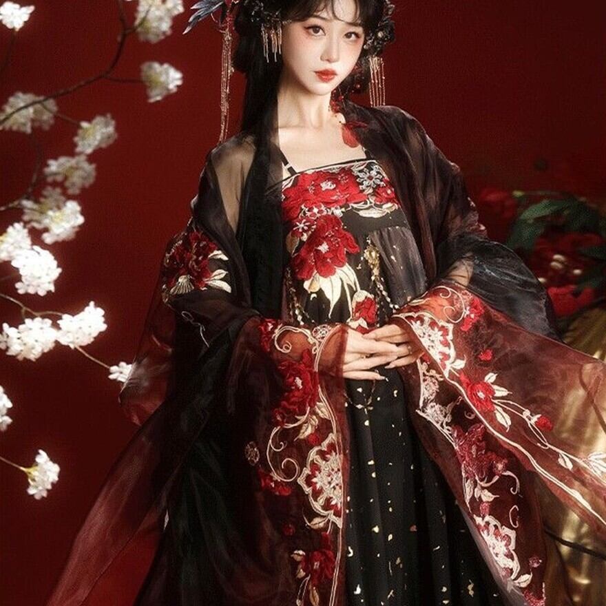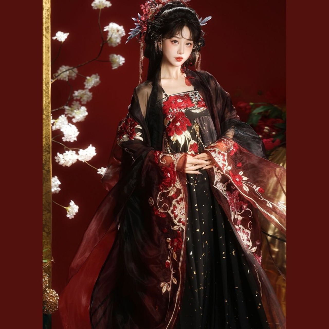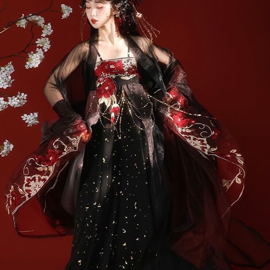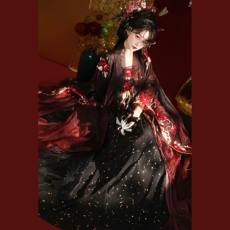 黒を基調とした生地に、深紅の刺繍が映える豪華な漢服スタイルです。