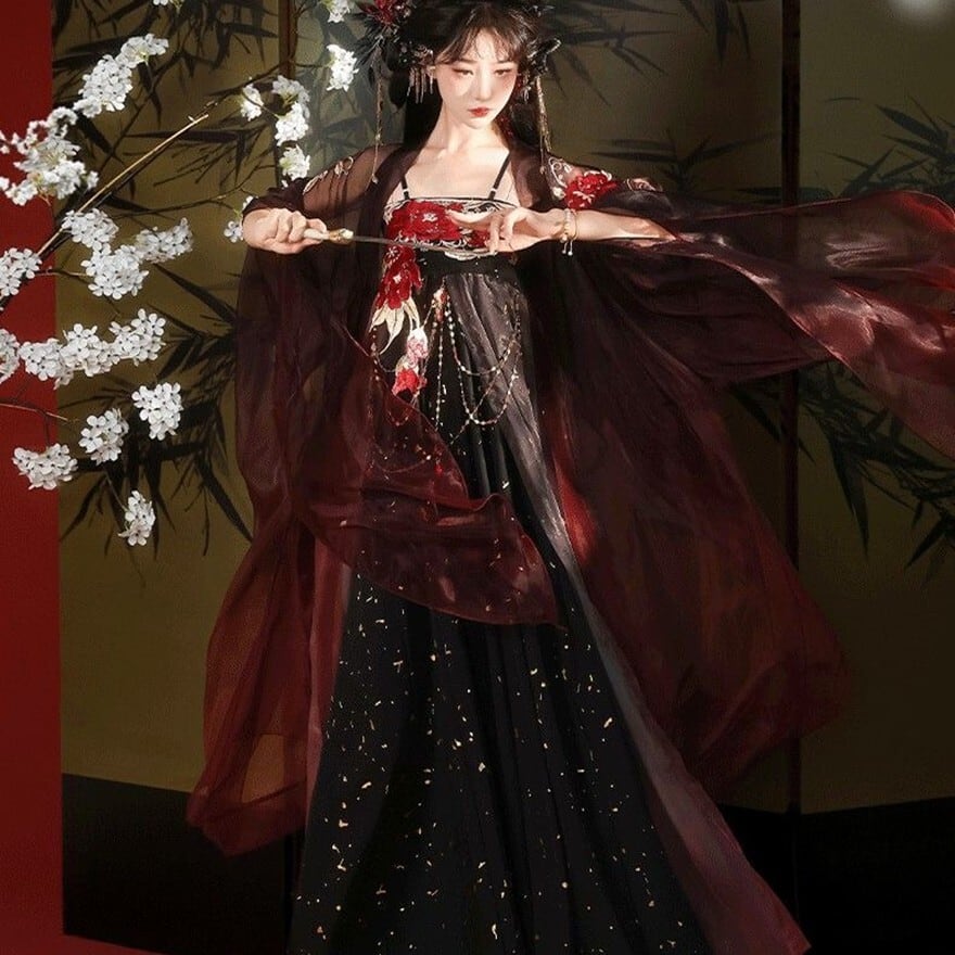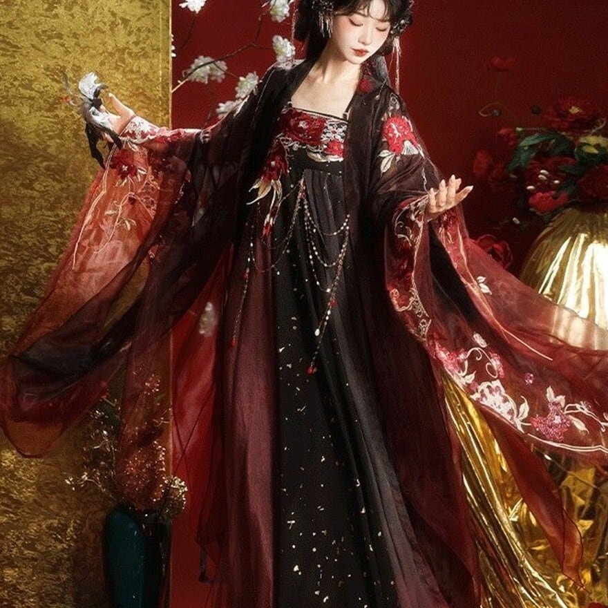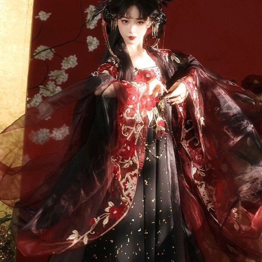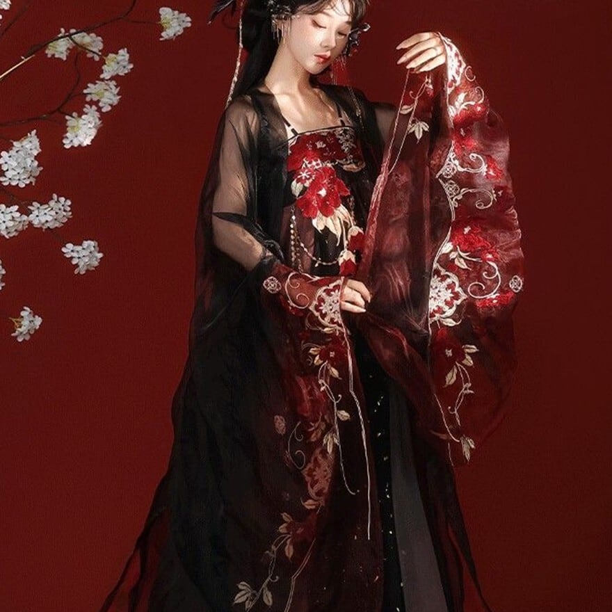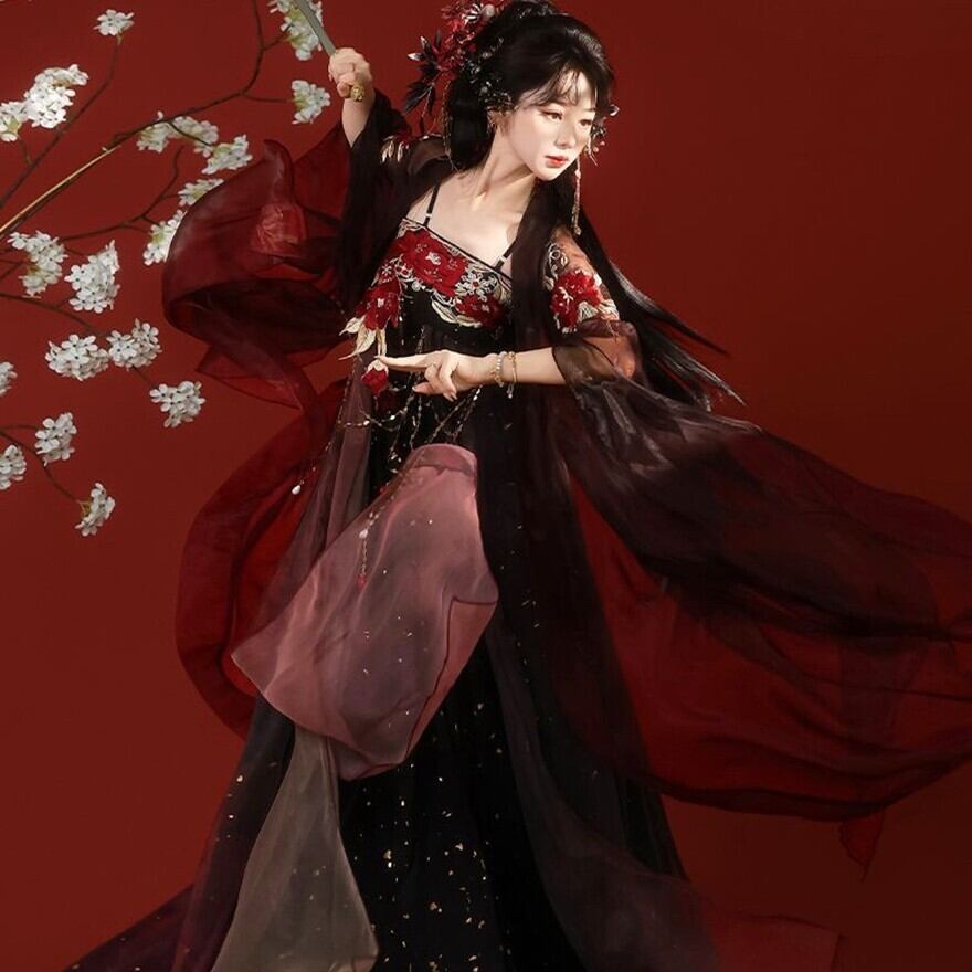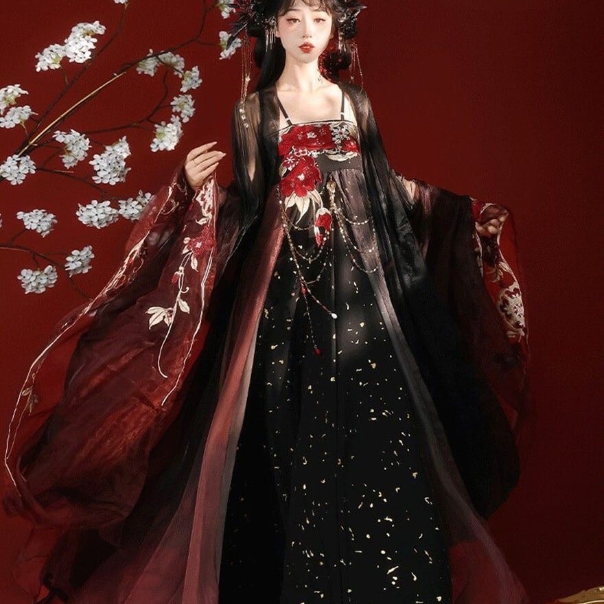 黒を基調とした生地に、深紅の刺繍が映える豪華な漢服スタイルです。
