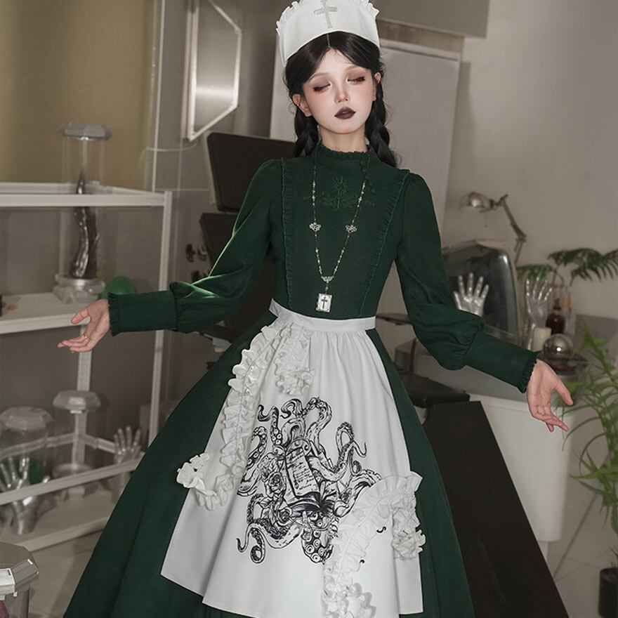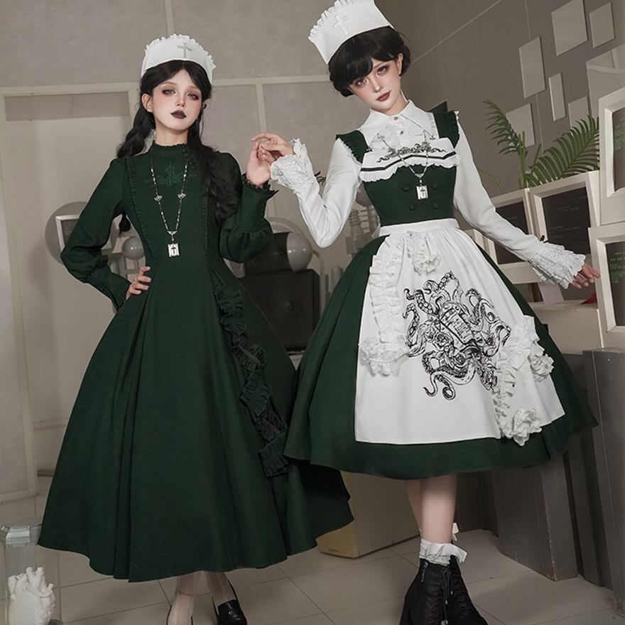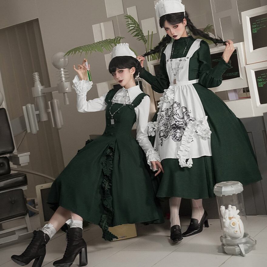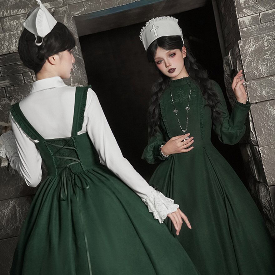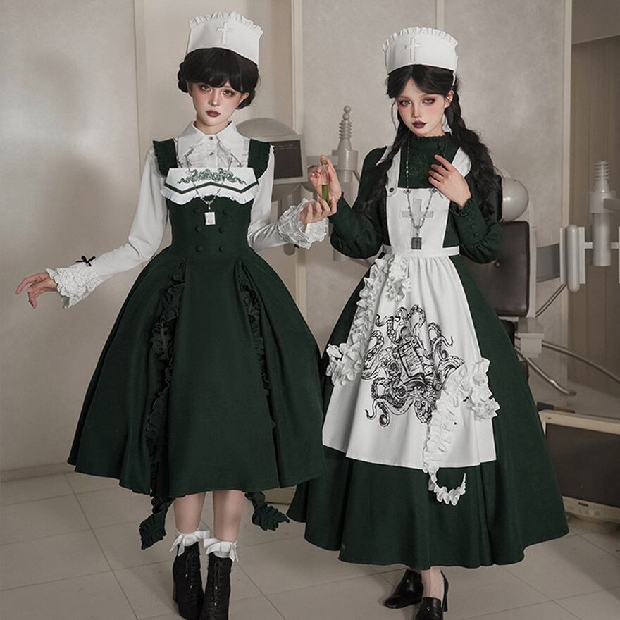 関連キーワード: #ゴスロリ #ロリータ #ナース風 #ダークグリーン #エプロン #刺繍 #病みかわいい #セットアップ #ハロウィン #コスプレ #撮影会