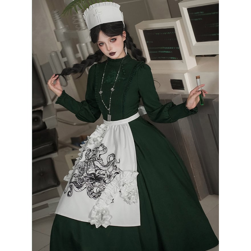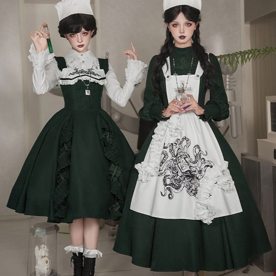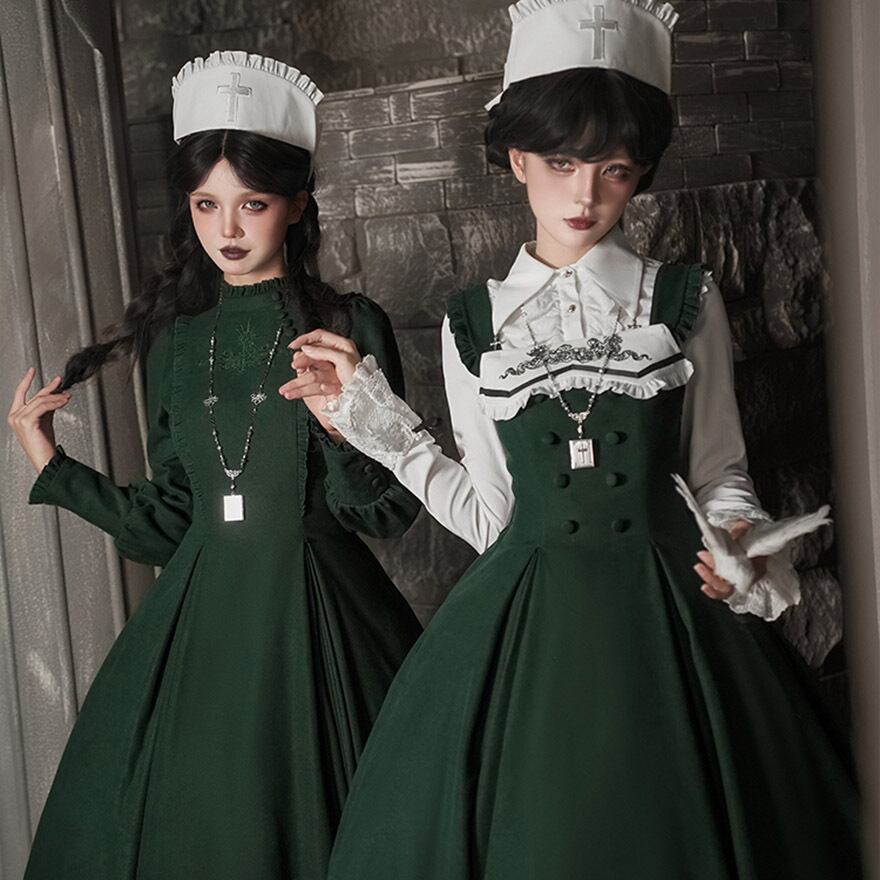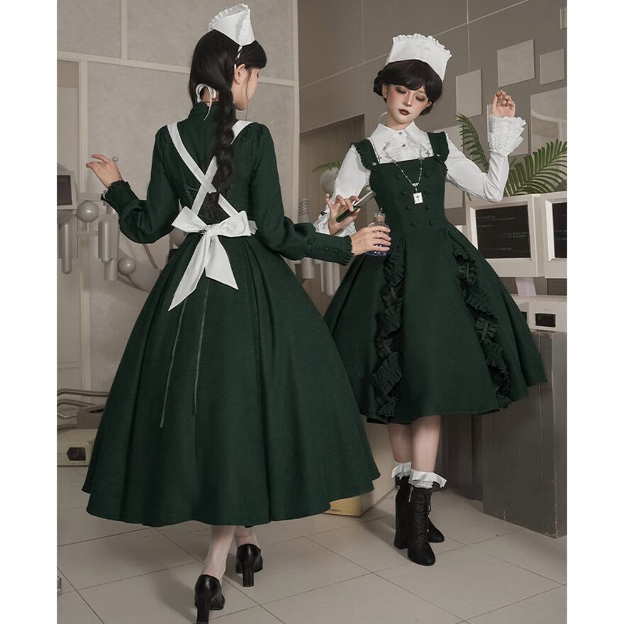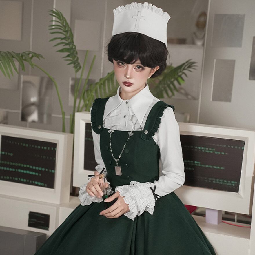 関連キーワード: #ゴスロリ #ロリータ #ナース風 #ダークグリーン #エプロン #刺繍 #病みかわいい #セットアップ #ハロウィン #コスプレ #撮影会