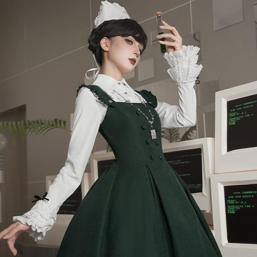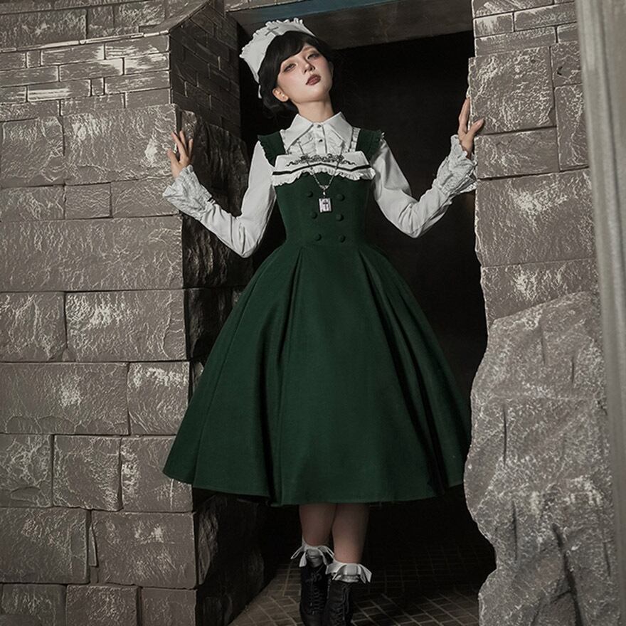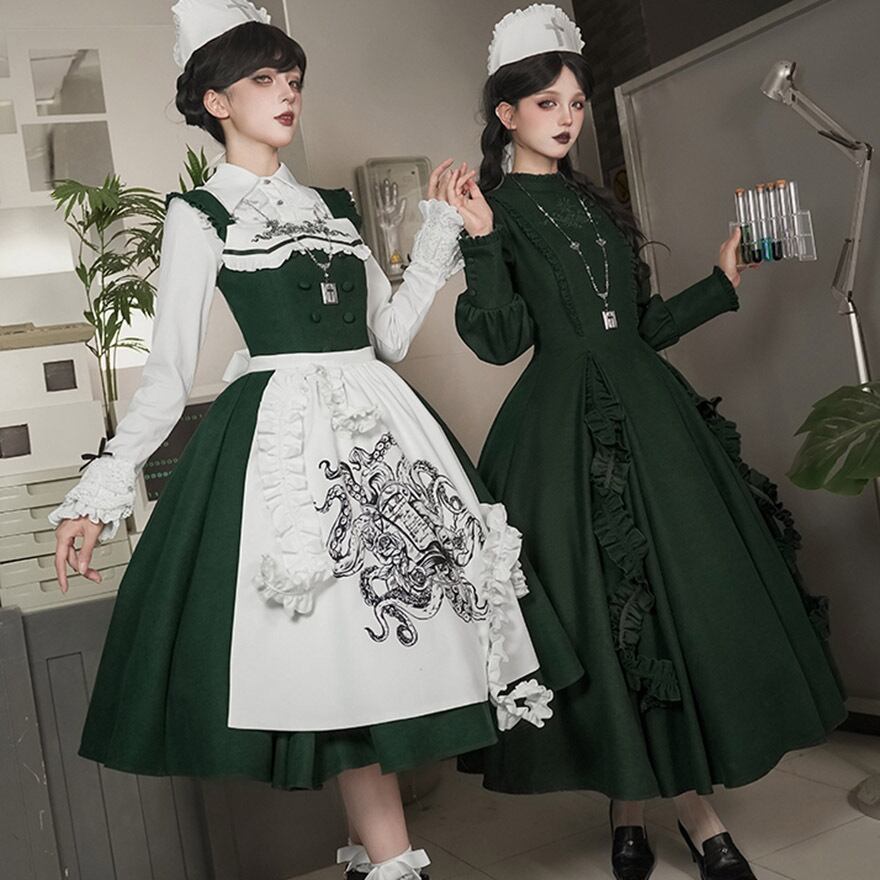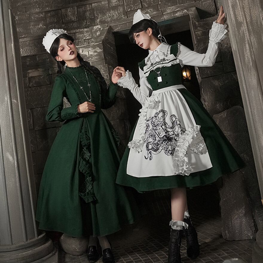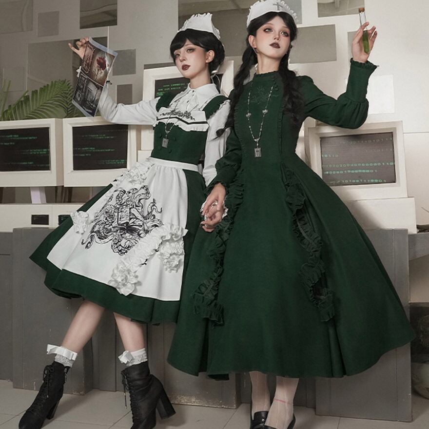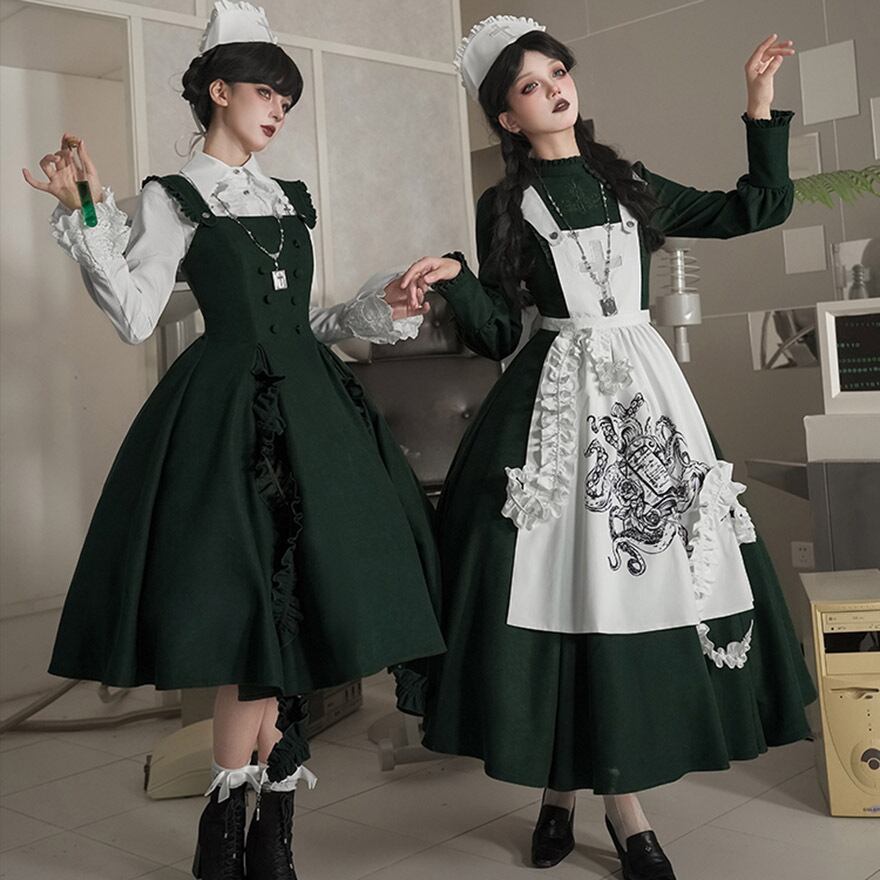 深いダークグリーンのジャンパースカートに、独創的な刺繍が施された純白のエプロンを合わせた、存在感抜群のゴスロリセットです。