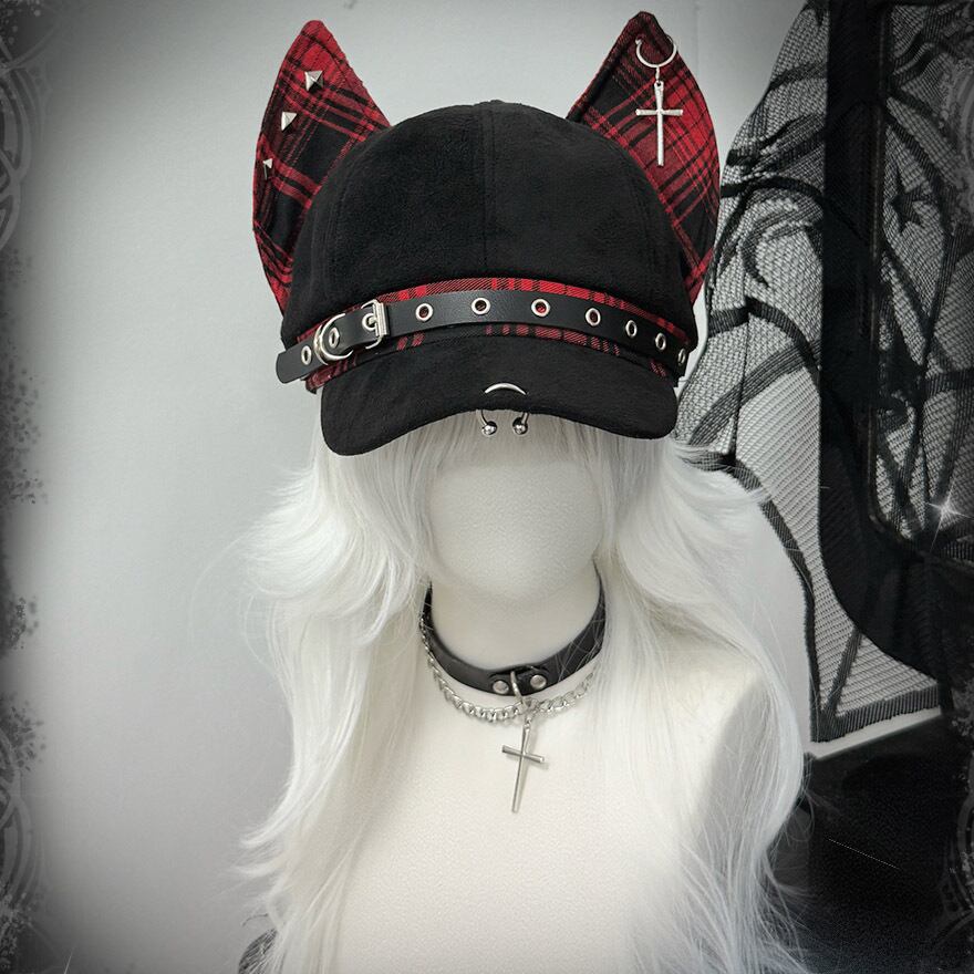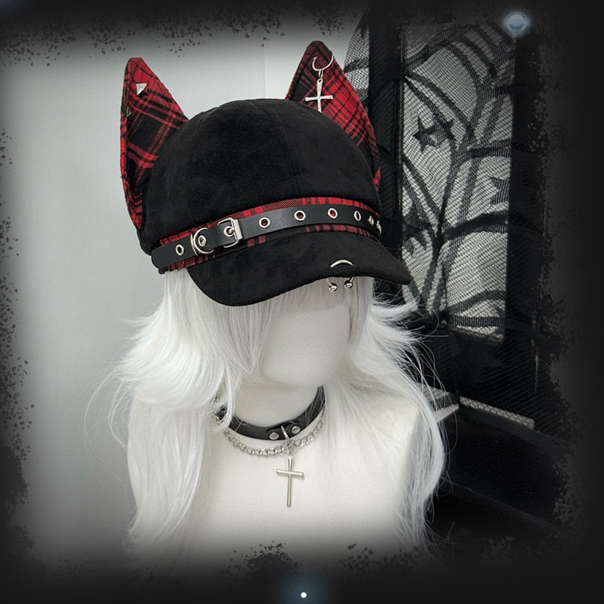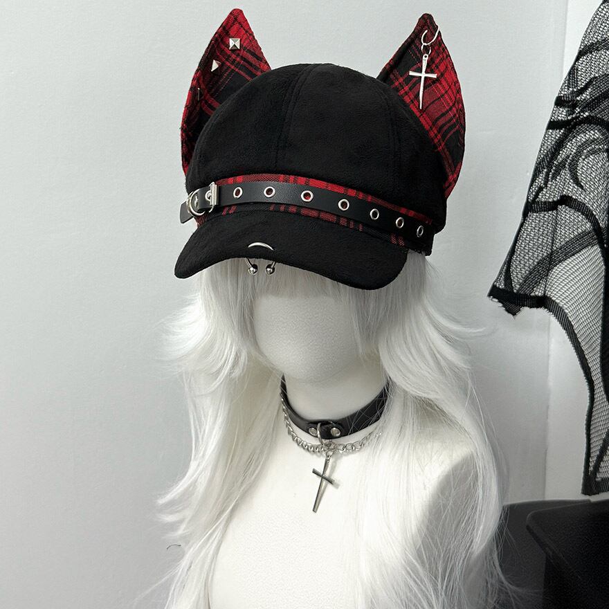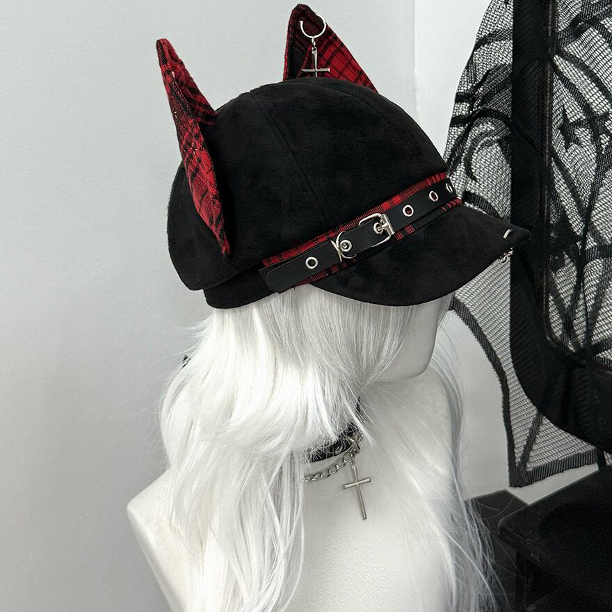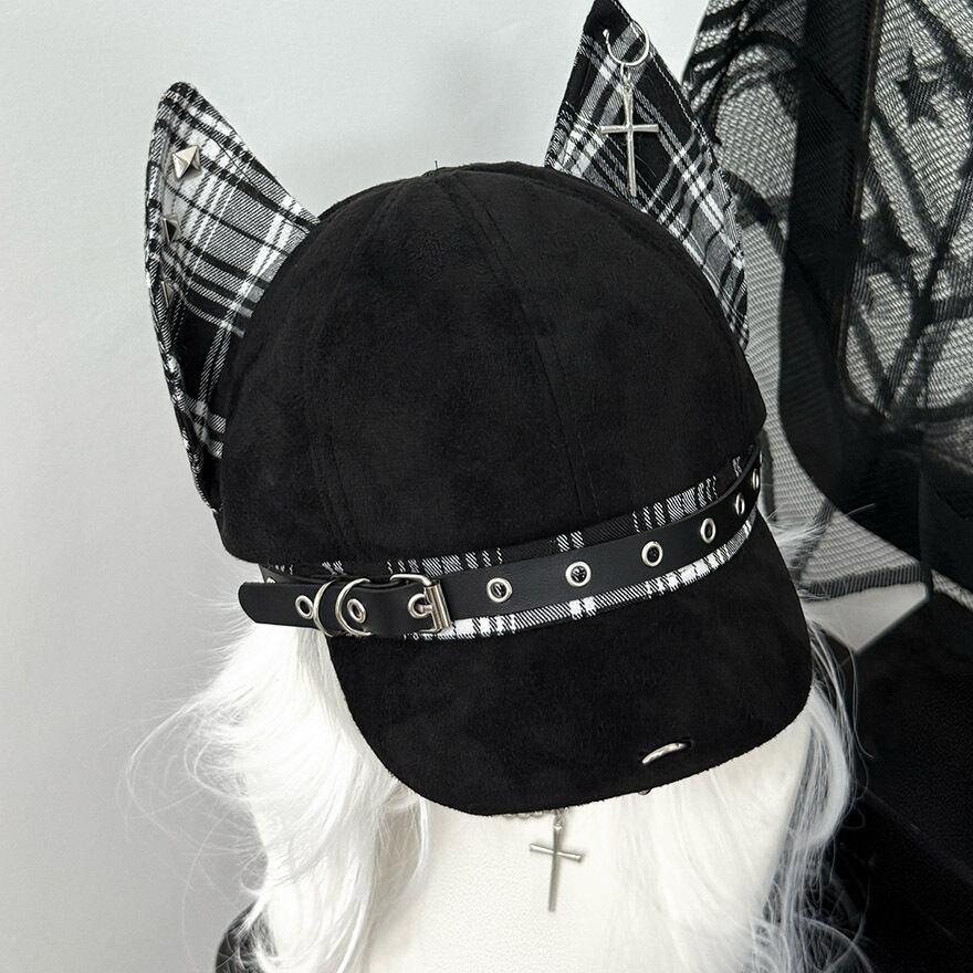 大きな猫耳がインパクト抜群のキャップです。耳とベルト部分には、パンキッシュなチェック柄が施されています。
