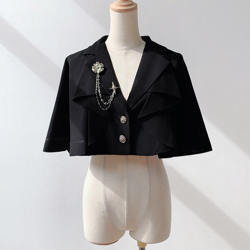 ジャケットのようなシャープな襟元と、ふわりと広がるケープのシルエットが融合した、気品あふれるショート丈のアウターです。