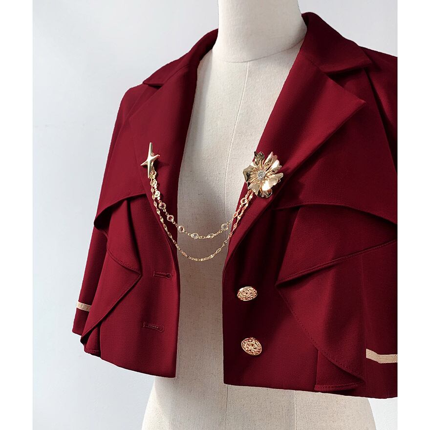 胸元には、取り外し可能な星と花のモチーフが輝くチェーンブローチがあしらわれ、コーディネートに華やかなアクセントを加えます。