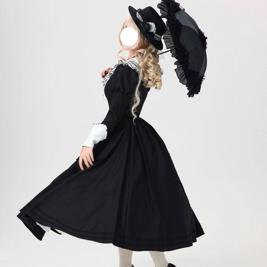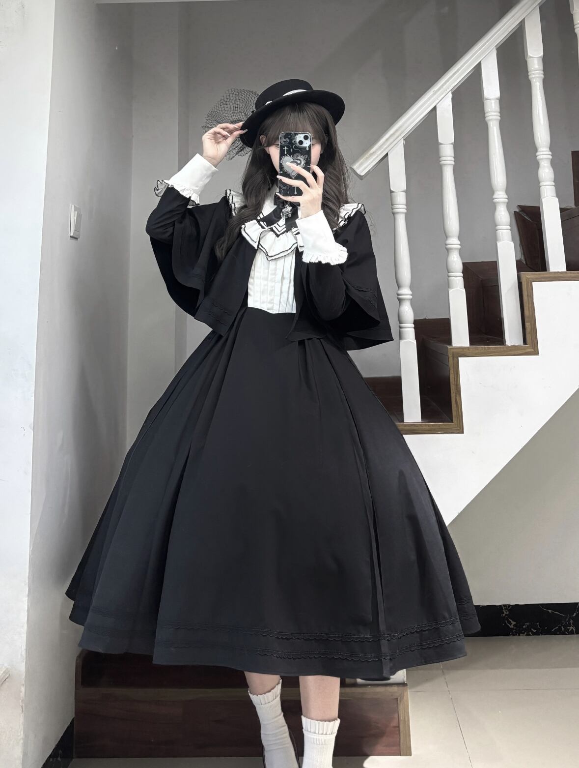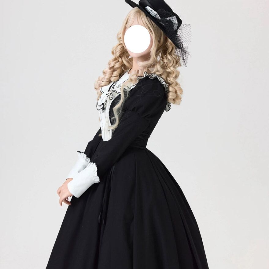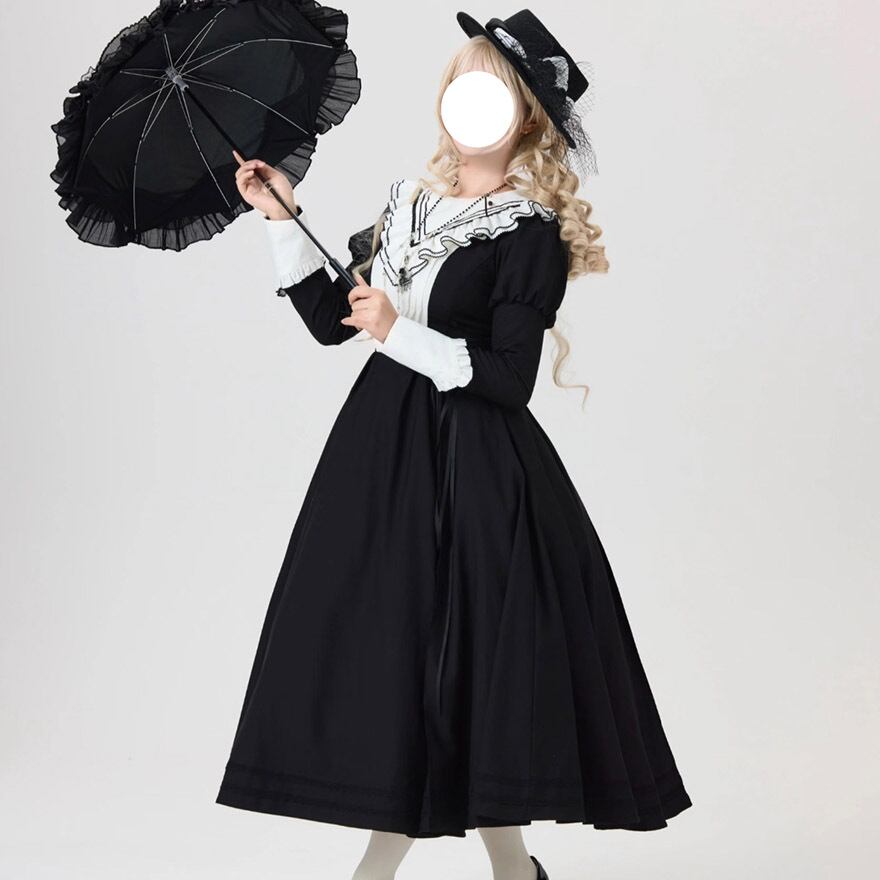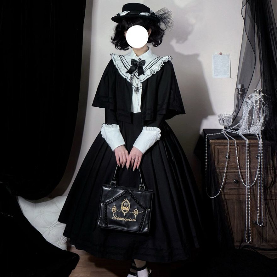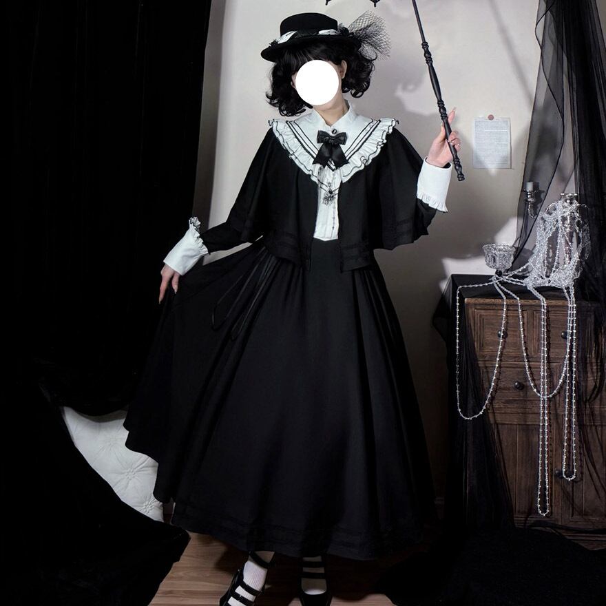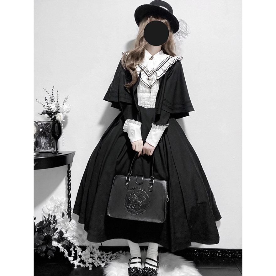 清楚な白のブラウス風ワンピースに、黒のケープを重ねた、修道女を彷彿とさせるゴシックロリータのセットアップです。