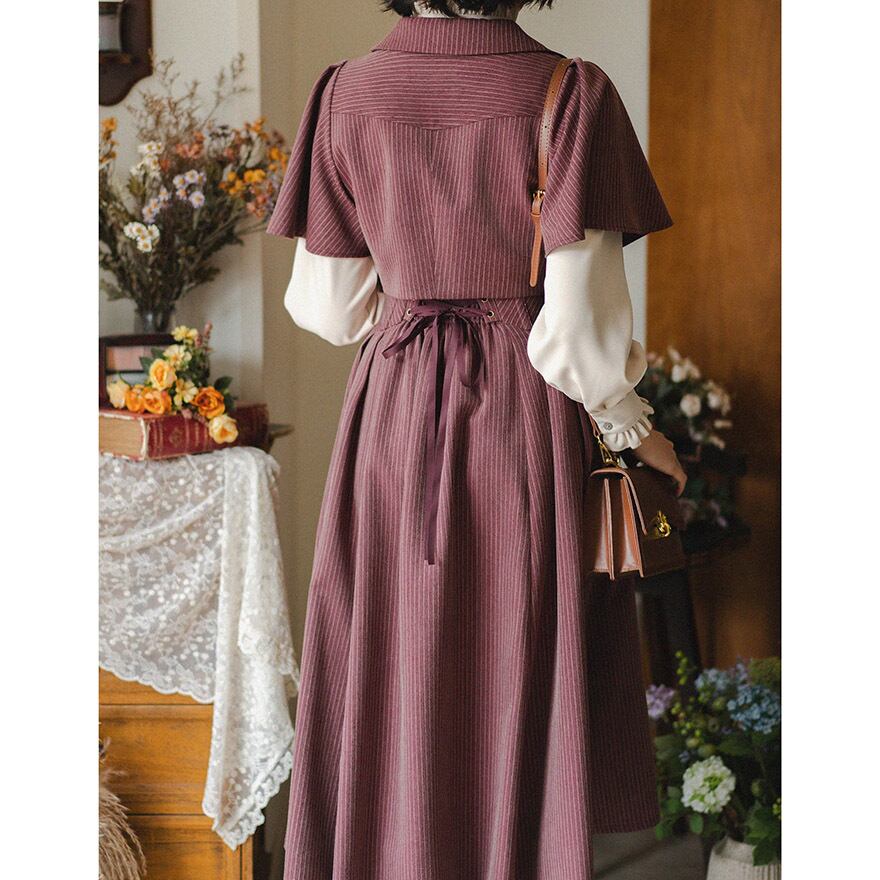 知的な印象を与えるピンストライプ柄と、フロントに並んだアンティーク調のボタンが、ヴィンテージ感を高めます。