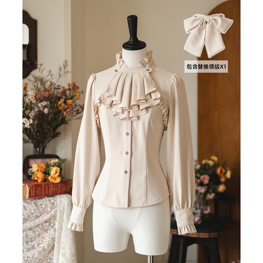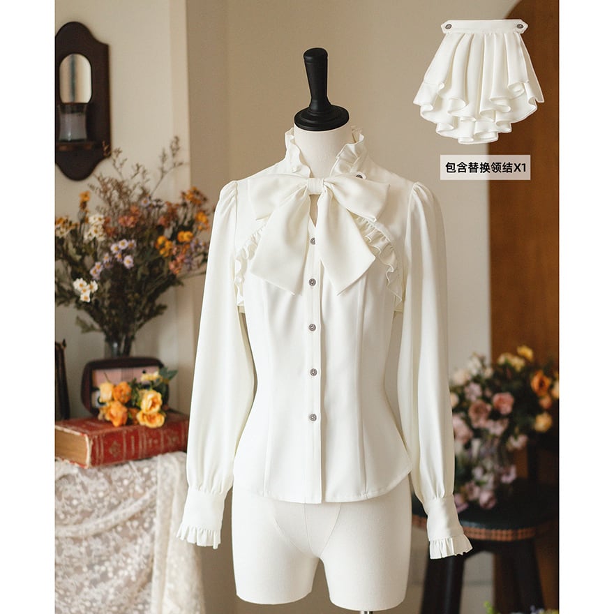 大きなリボンと、幾重にも重なったフリルのジャボ、二種類の付け替え可能なネックアクセサリーがセットになったクラシカルブラウスです。