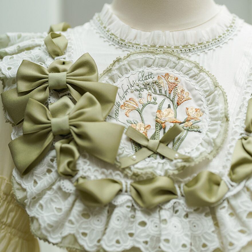 幾重にも重なった胸元のフリルとレースが、顔周りを華やかに彩ります。