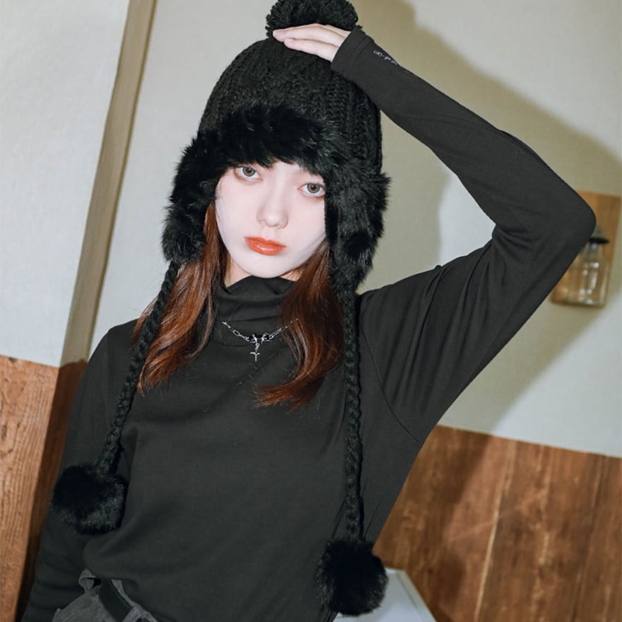 耳当てとポンポン付きの三つ編みがキュートなニット帽タイプと、トレンド感あふれるファーバケットハットタイプの2種類から選べます。