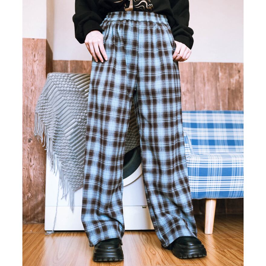 水色とブラウンを基調とした、どこか懐かしさを感じるクラシカルな配色のチェック柄パンツです。