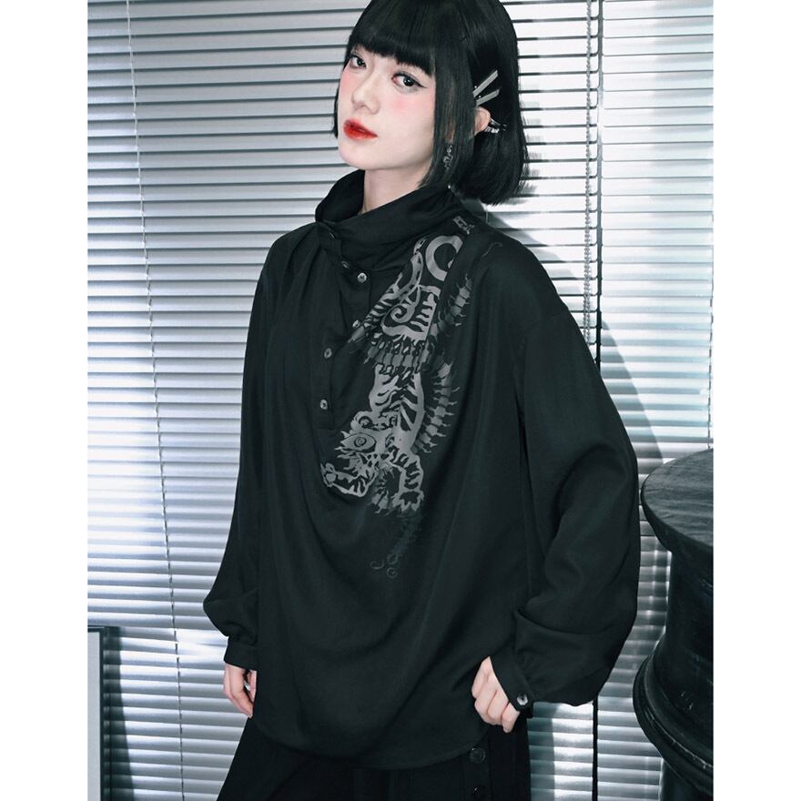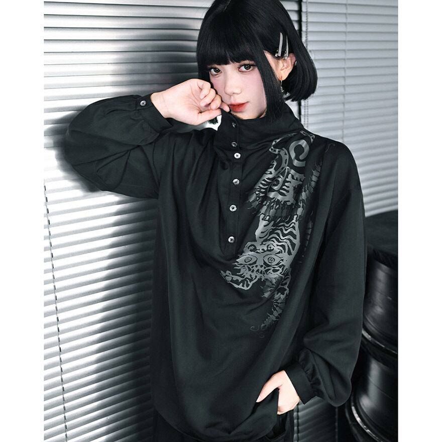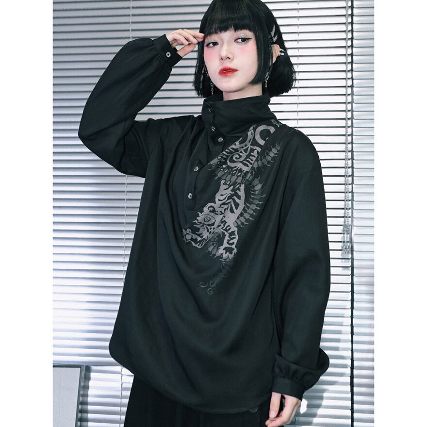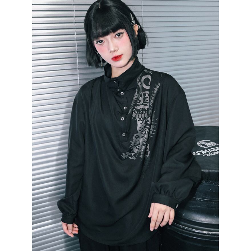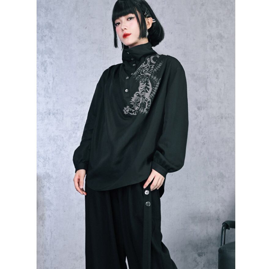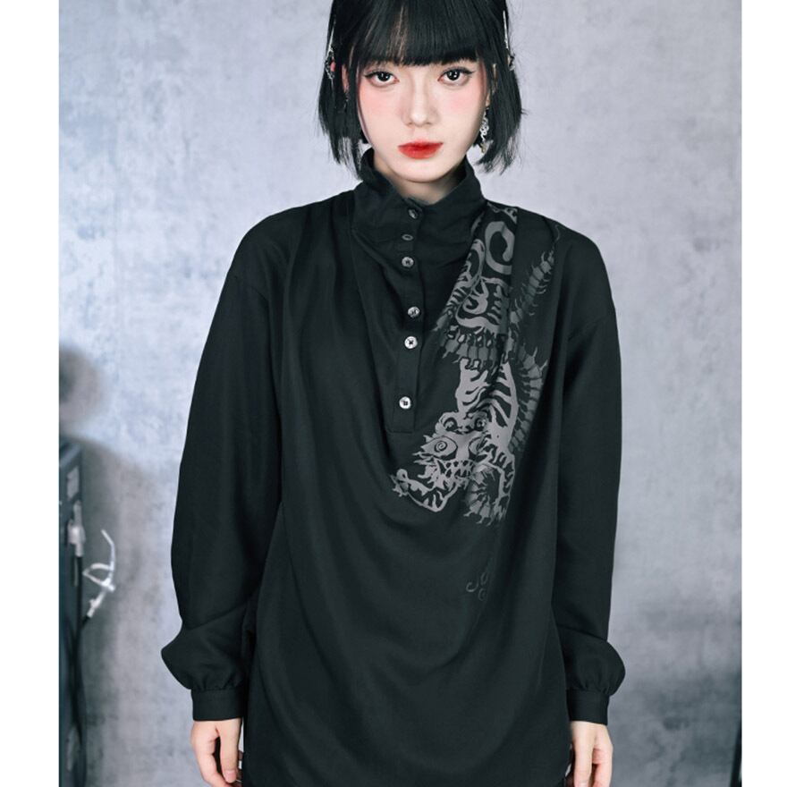 関連キーワード: #中華ゴシック #長袖シャツ #サブカルファッション #モード系 #ストリートファッション #龍 #プリント #スタンドカラー #アシンメトリー #個性的 #ダークファッション