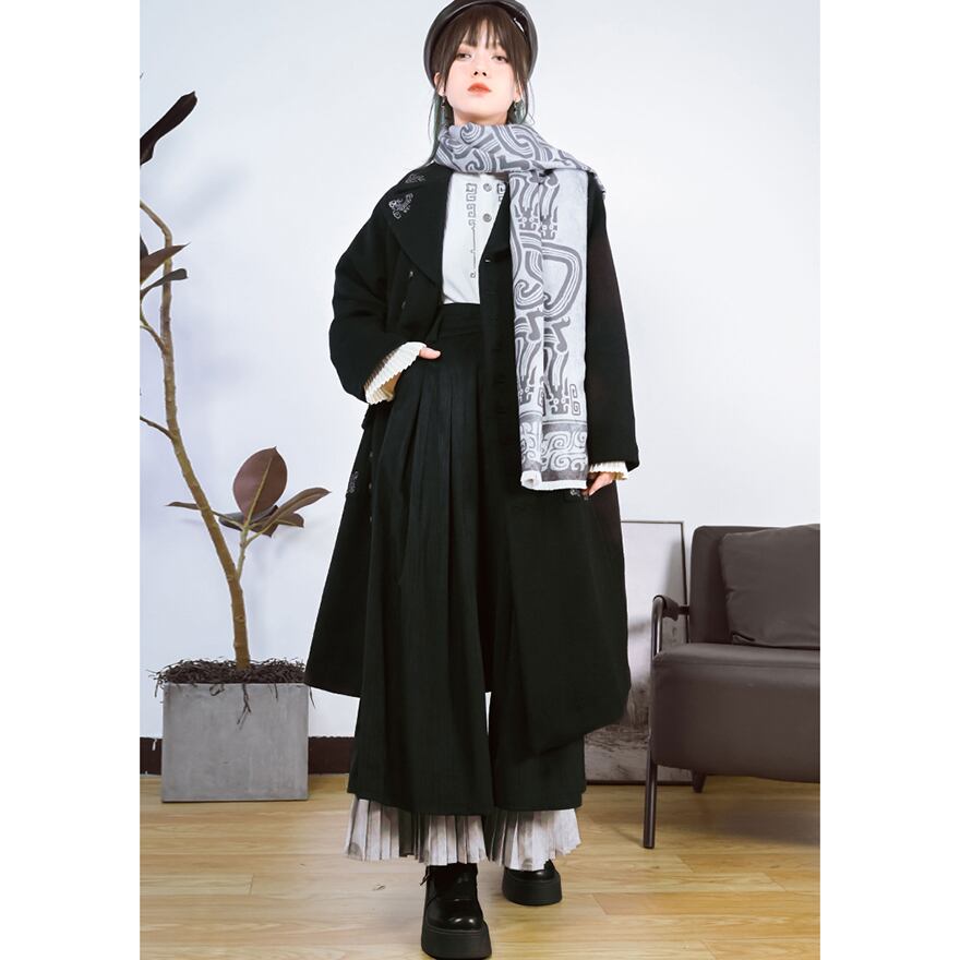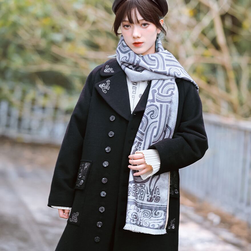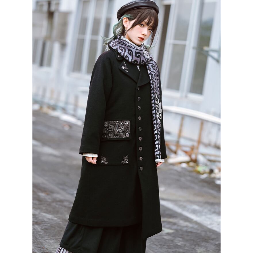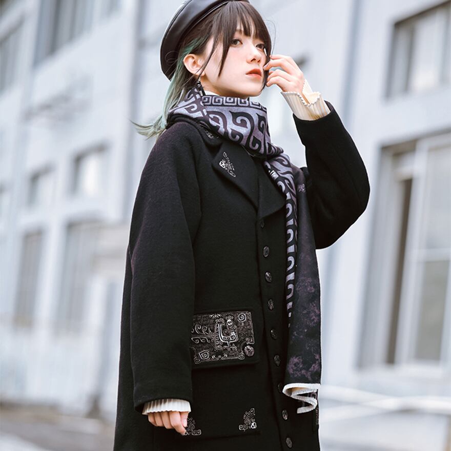 漆黒のウール生地に、古代中国の青銅器を思わせるミステリアスな銀刺繍が施されたロングコートです。