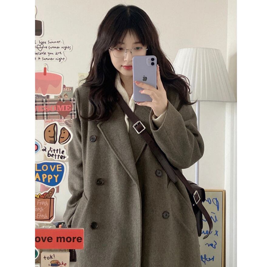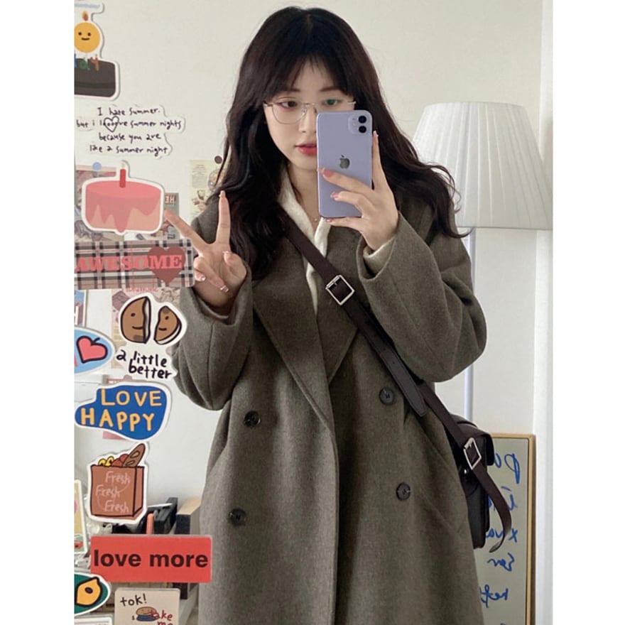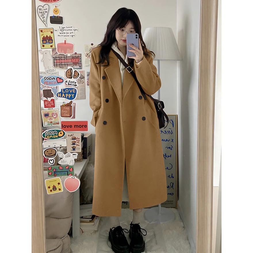 定番のテーラードカラーが上品な、ダブルボタンのロングコートです。