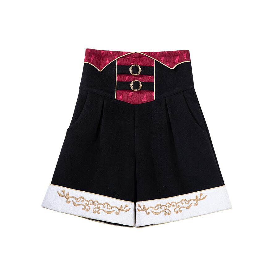 スタンドカラーのブラウスに、赤と金の差し色が映えるベスト、そして裾に白い装飾があしらわれたショートパンツがセットになっています。