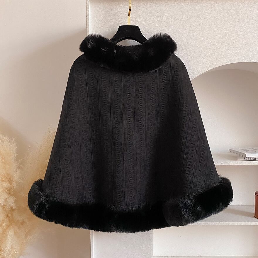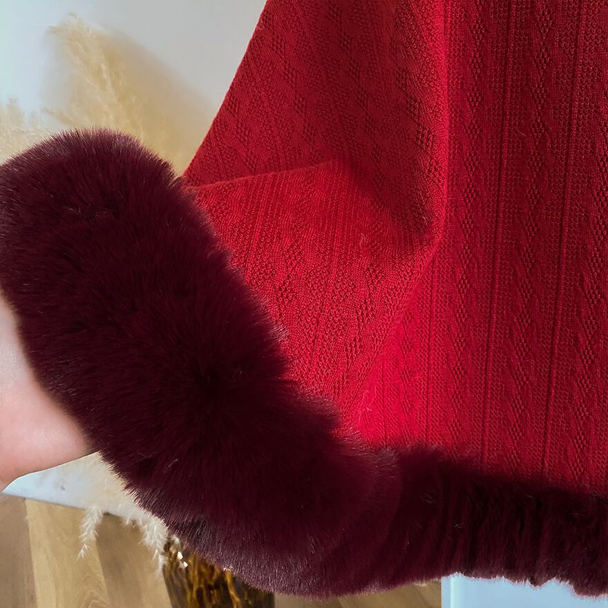 襟元と裾に贅沢にあしらわれたフェイクファーが、顔周りを華やかに見せてくれる中華風のマントです。