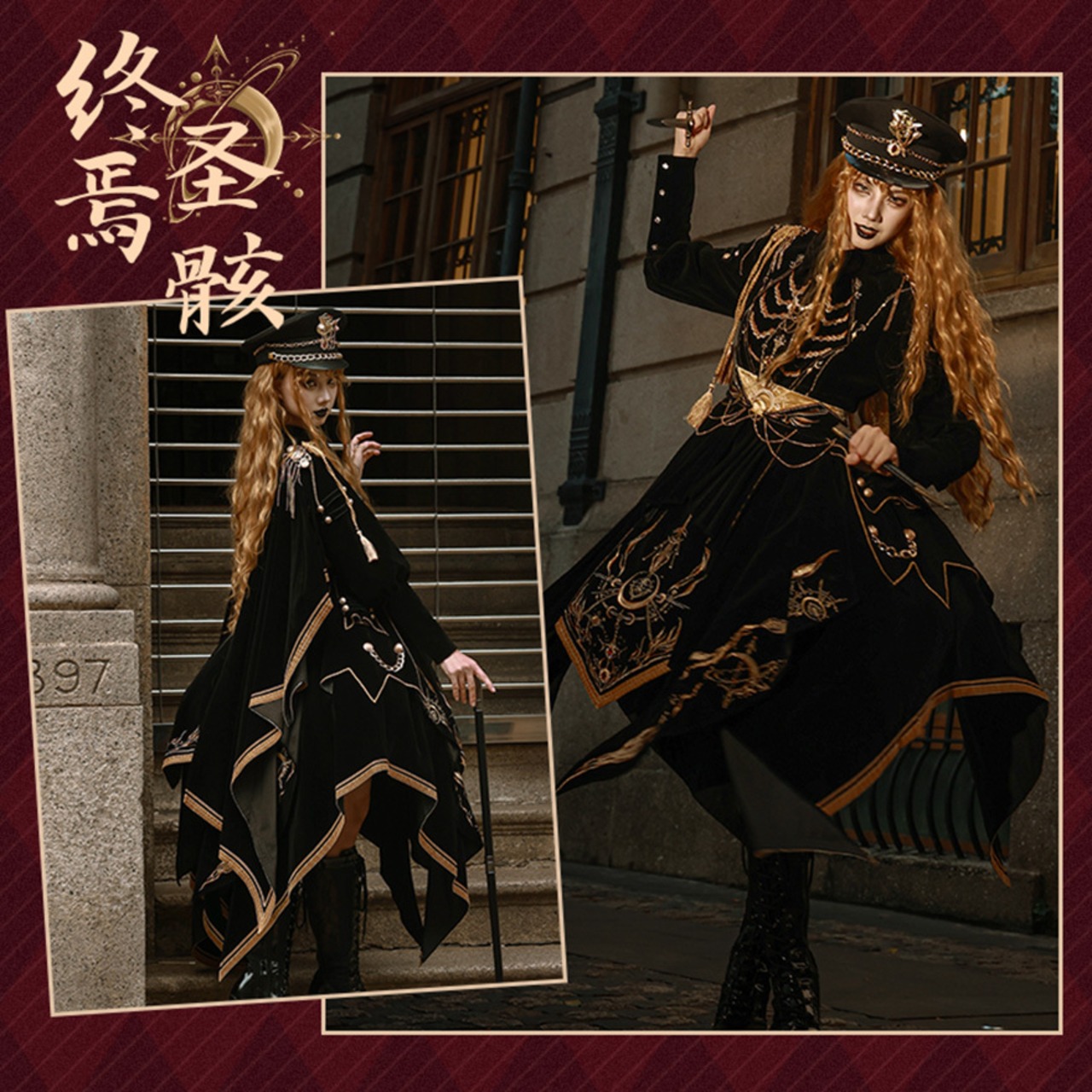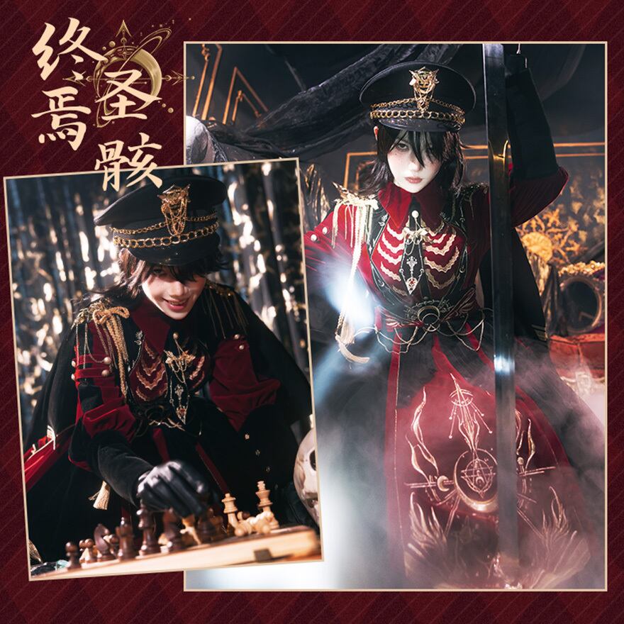 スタンドカラーのジャケットには、豪華な金の刺繍と肩章が施され、凛とした力強さを演出します。