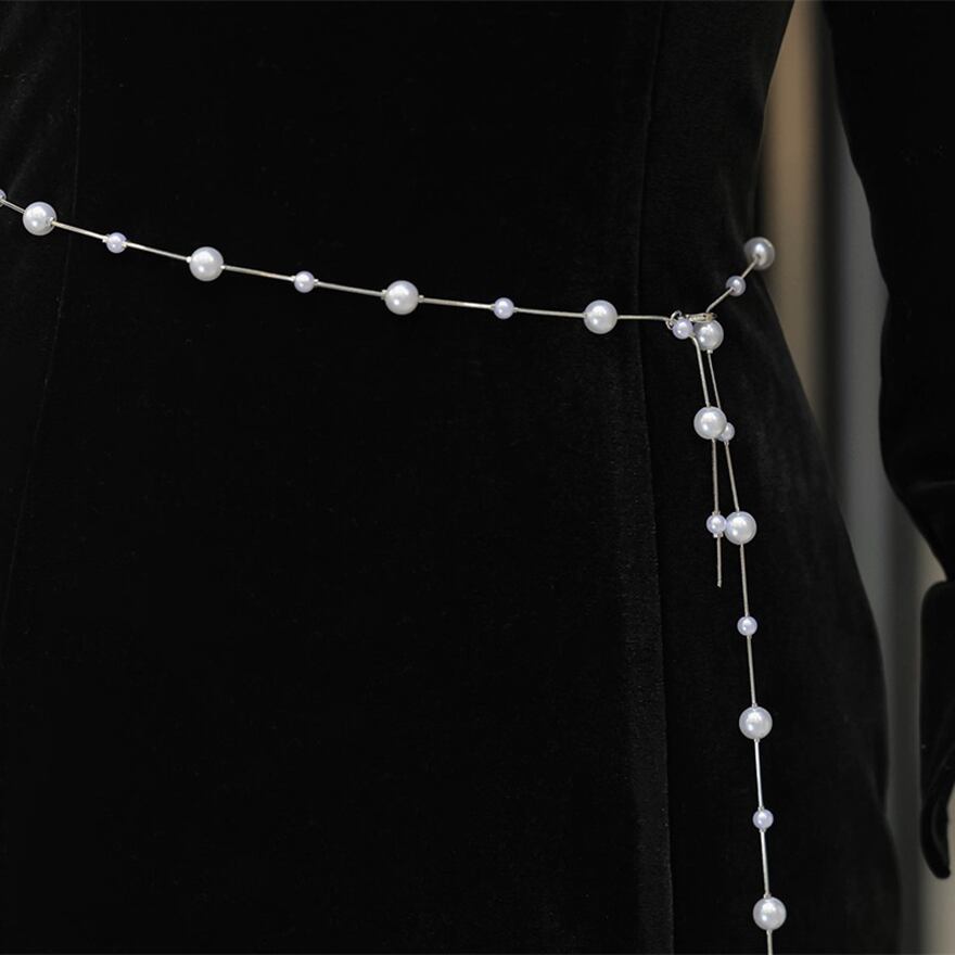 ウエストには華奢なパールチェーンのベルトが付属し、シルエットにアクセントをプラス。裾に向かって緩やかに広がるマーメイドラインが、立ち姿をエレガントに演出します。