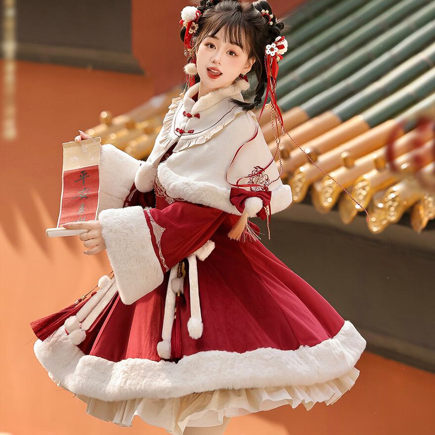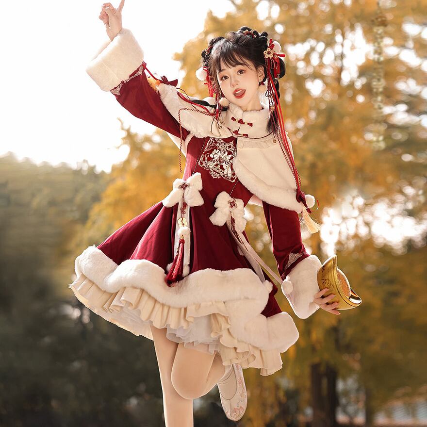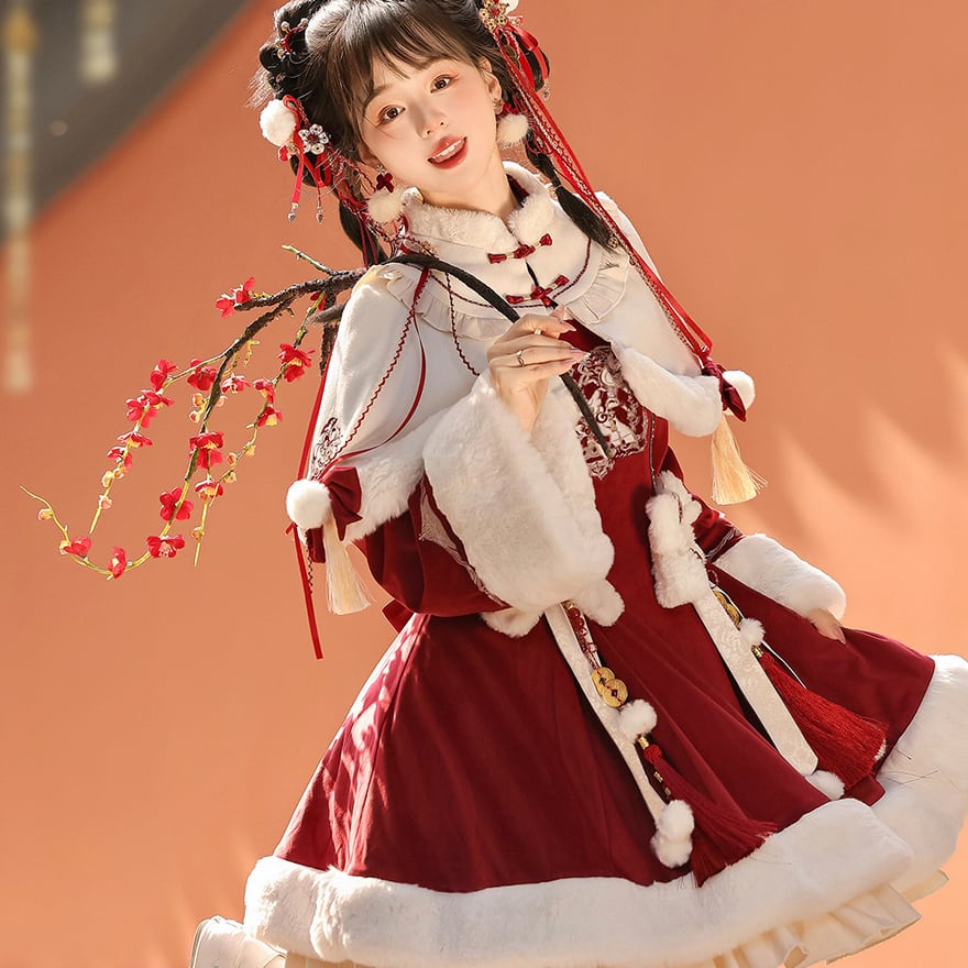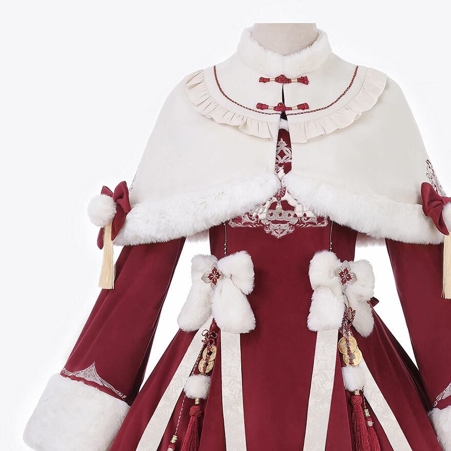 深みのある赤のベルベット調生地に、もこもこの白いファーが映える、愛らしい中華風ロリータのセットアップです。