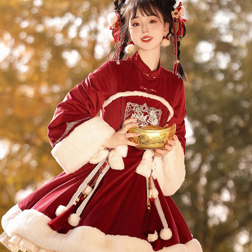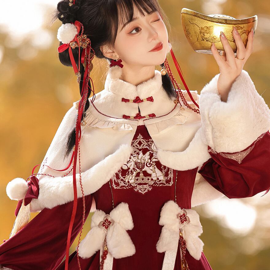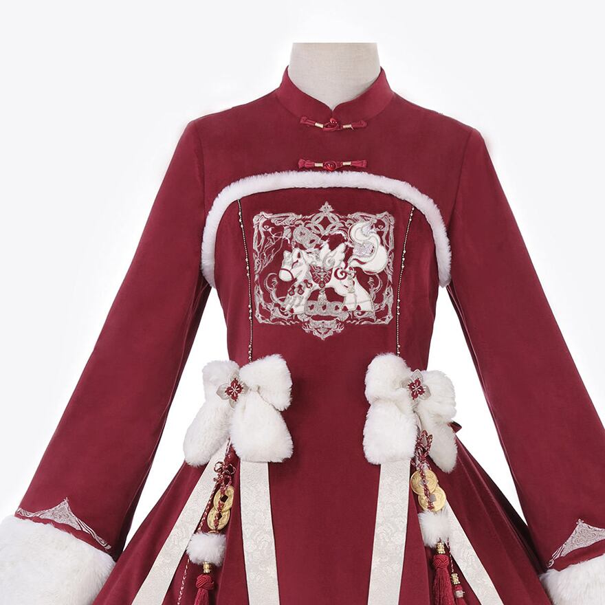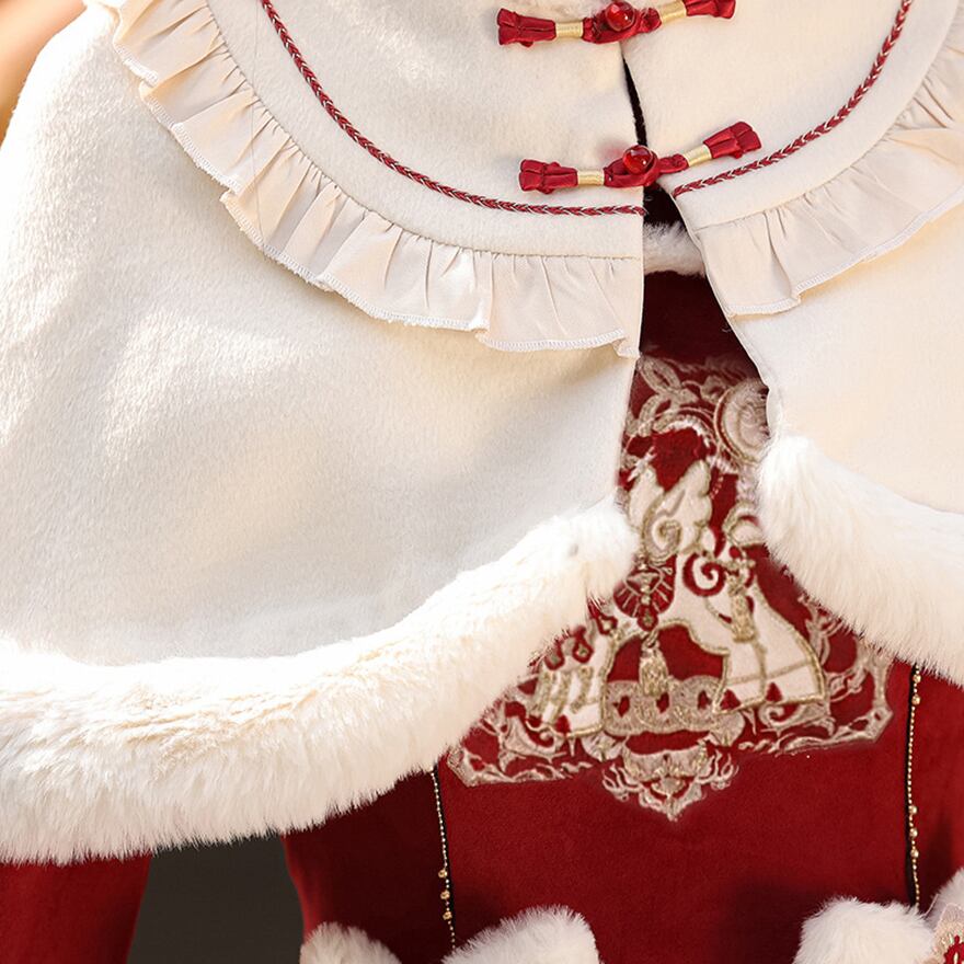 深みのある赤のベルベット調生地に、もこもこの白いファーが映える、愛らしい中華風ロリータのセットアップです。