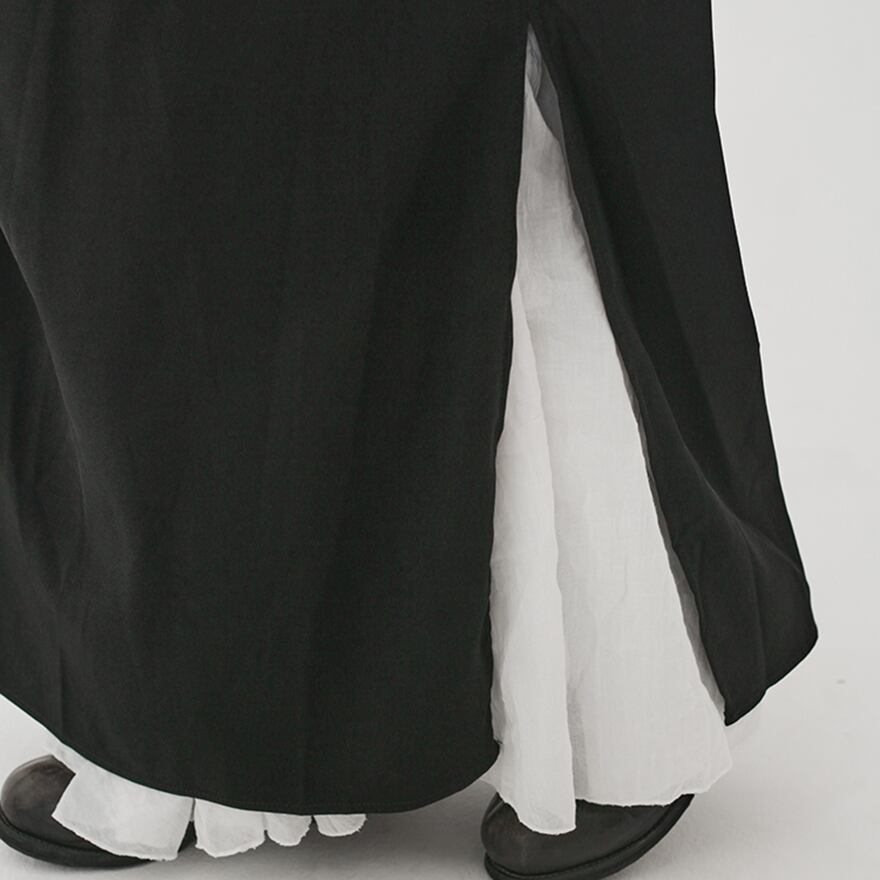 身体のラインを拾わないビッグシルエットと、深く入ったサイドスリットが、歩くたびに空気をはらんで優雅に揺れ動きます。