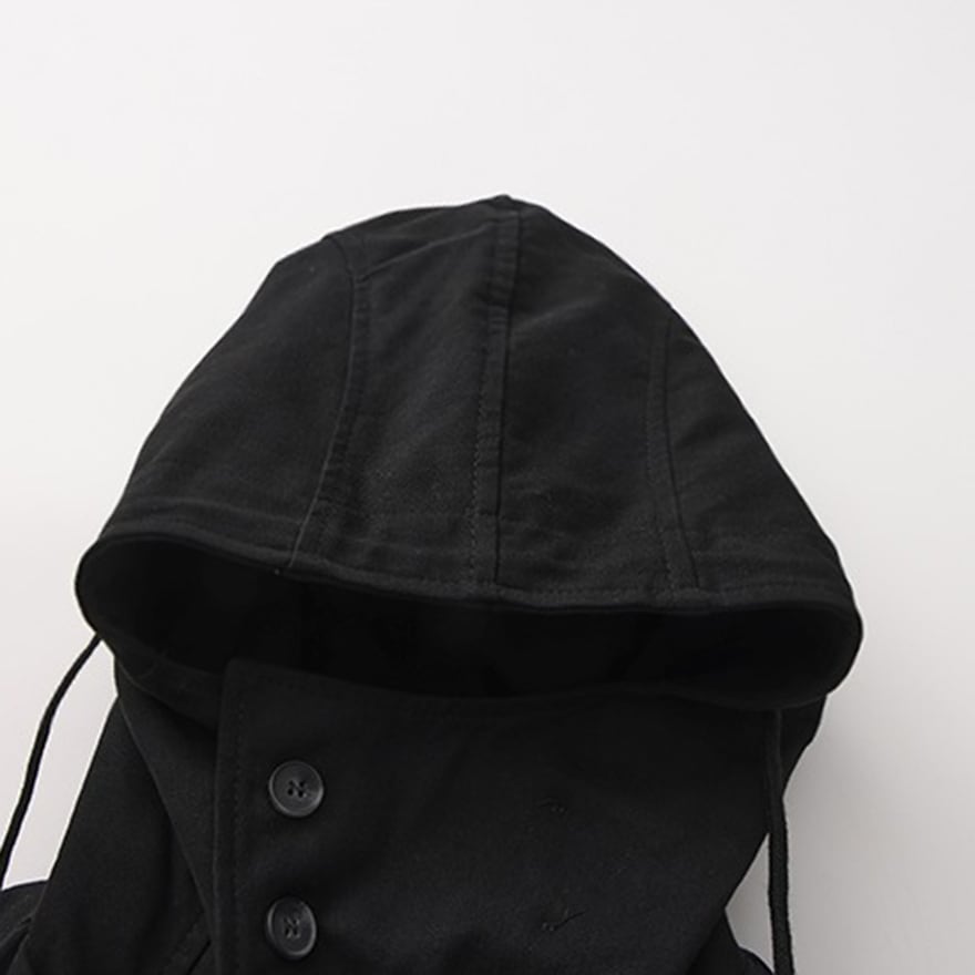 顔が隠れるほど深く大きなフードは、被るだけで独特の世界観を演出し、首元までボタンを留めれば防寒性も抜群。