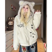 ボリューム感たっぷりのフェイクファーがあしらわれたネコ耳フードが、抜群のインパクトを放つジップアップジャケットです。
