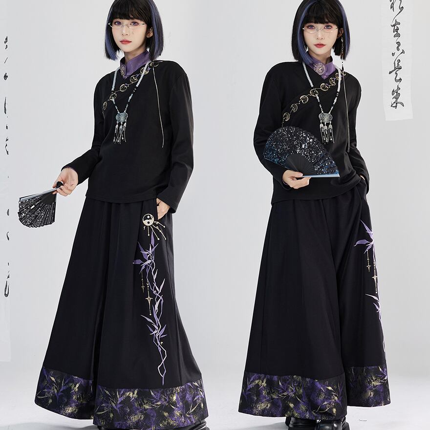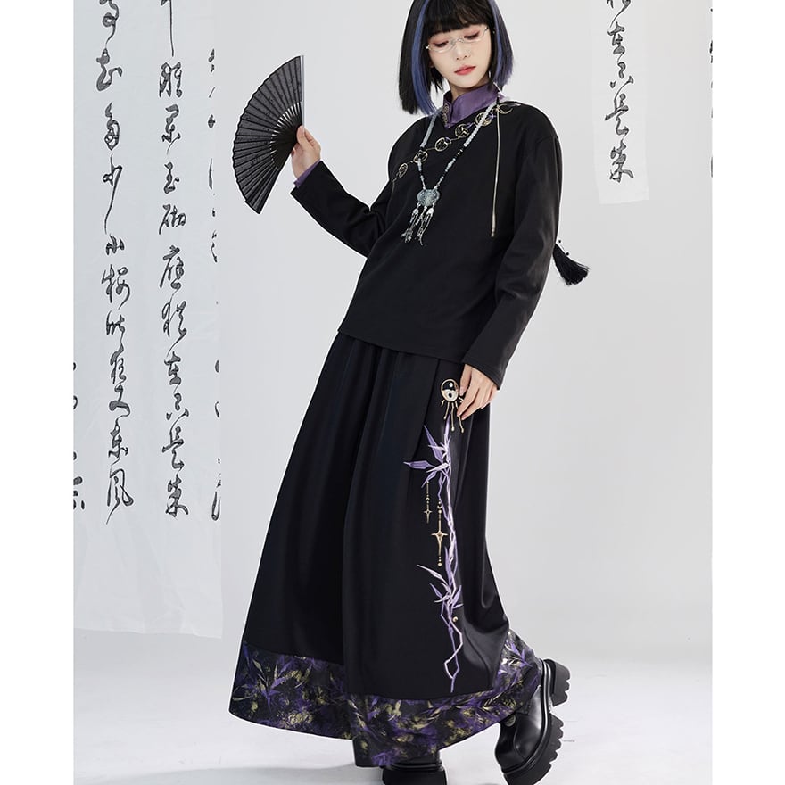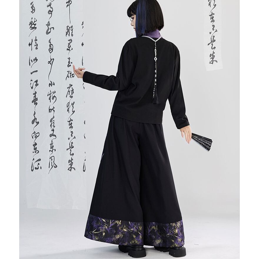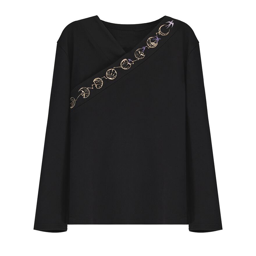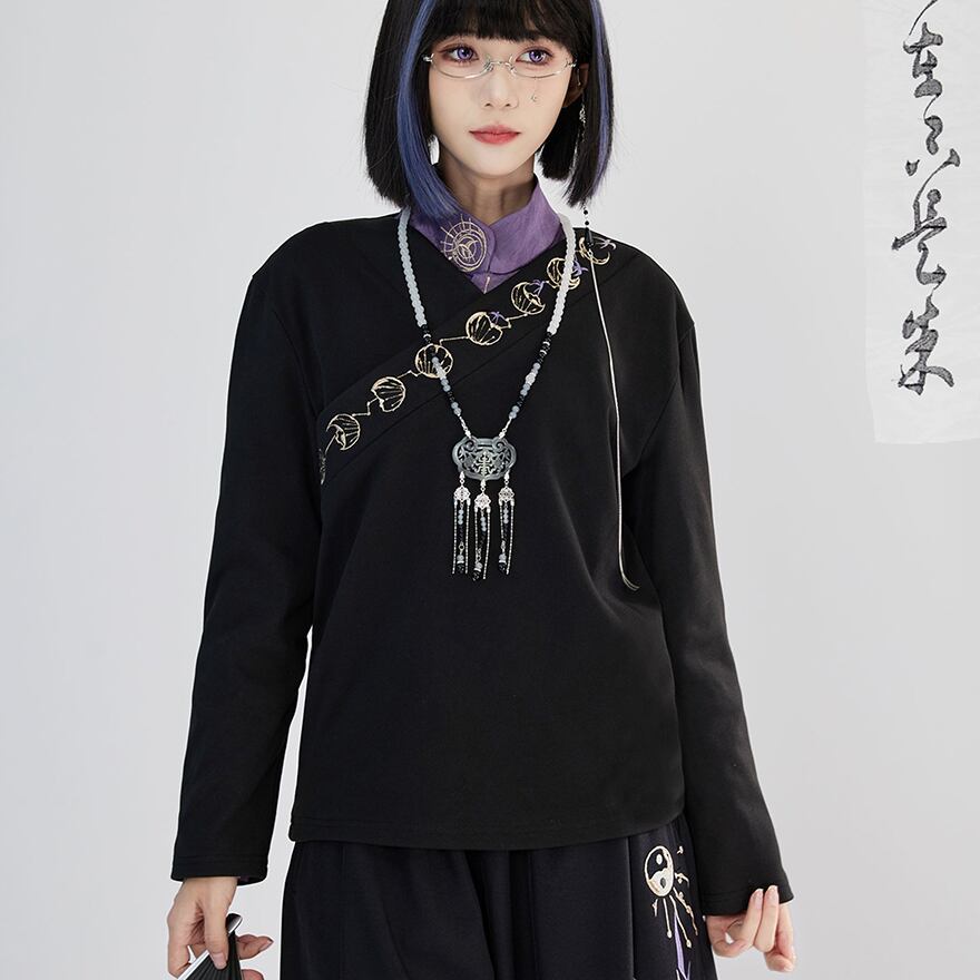 黒のシンプルな生地に、胸元を斜めに横切る月の満ち欠けを表現した金色の刺繍が映える、中華風の長袖トップスです。