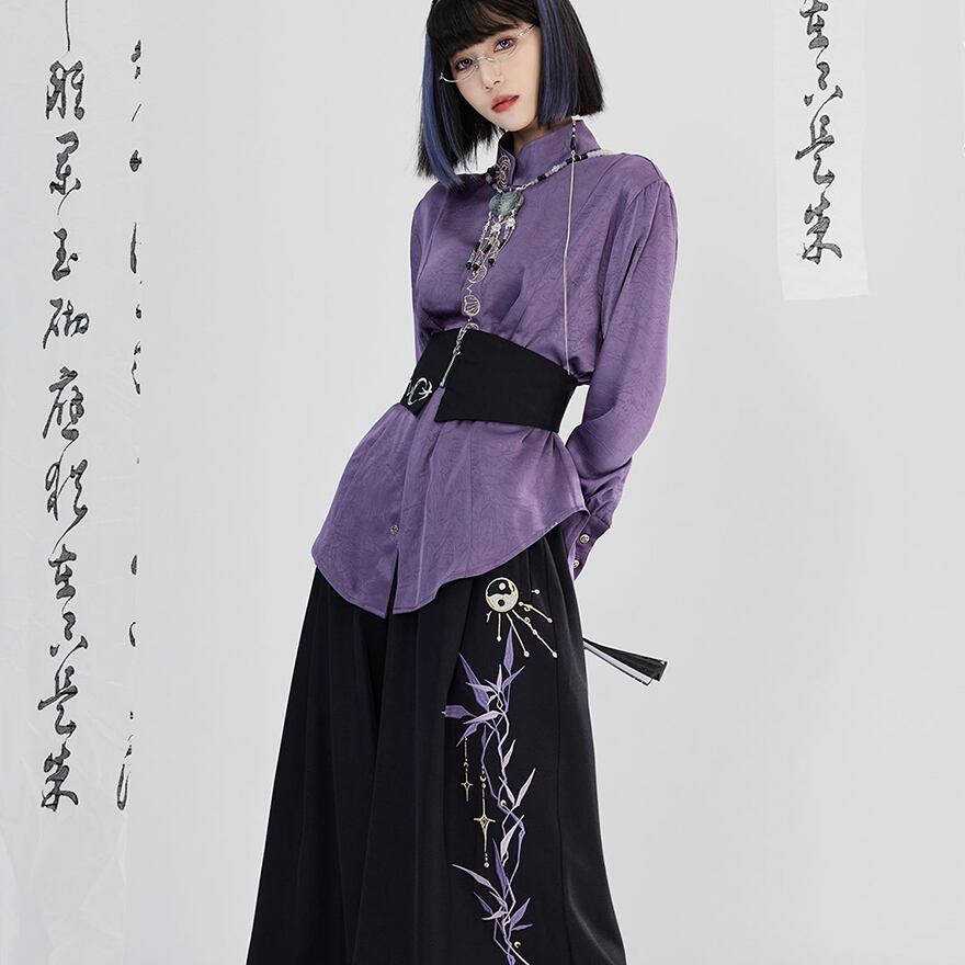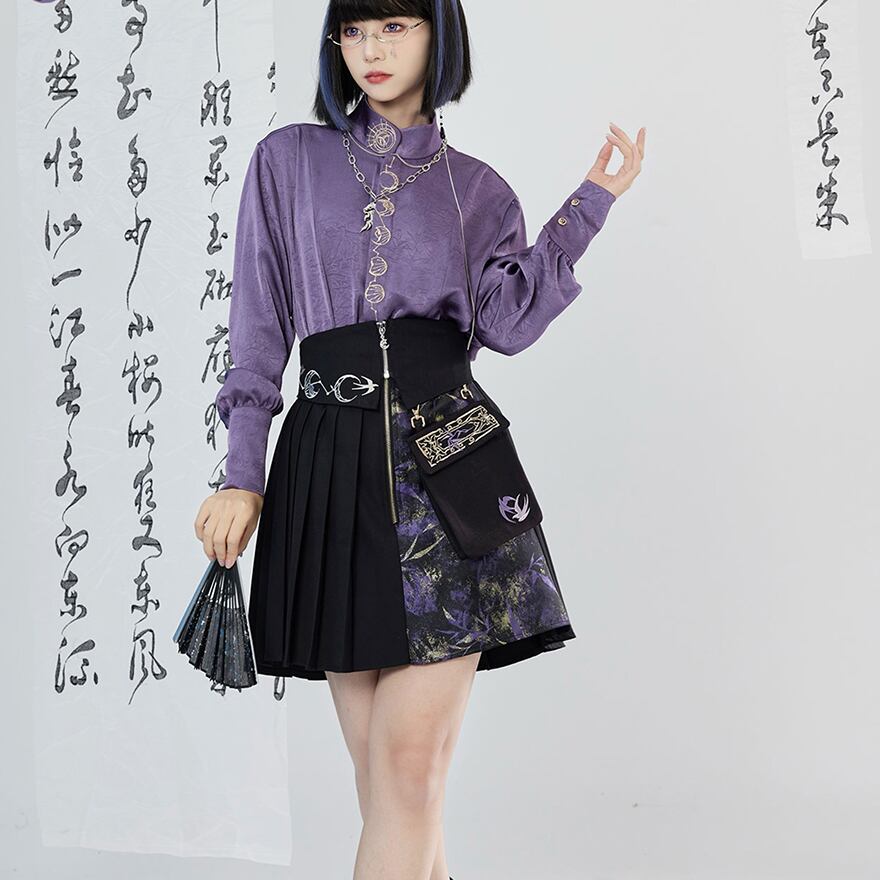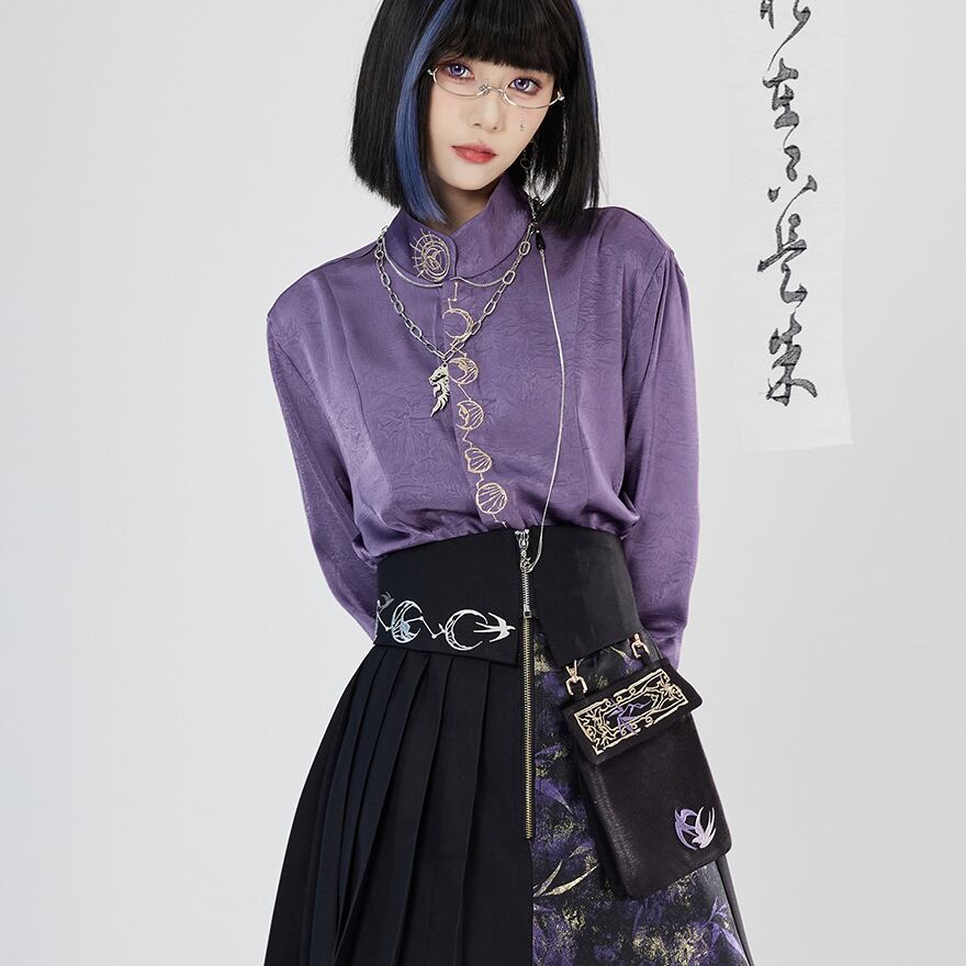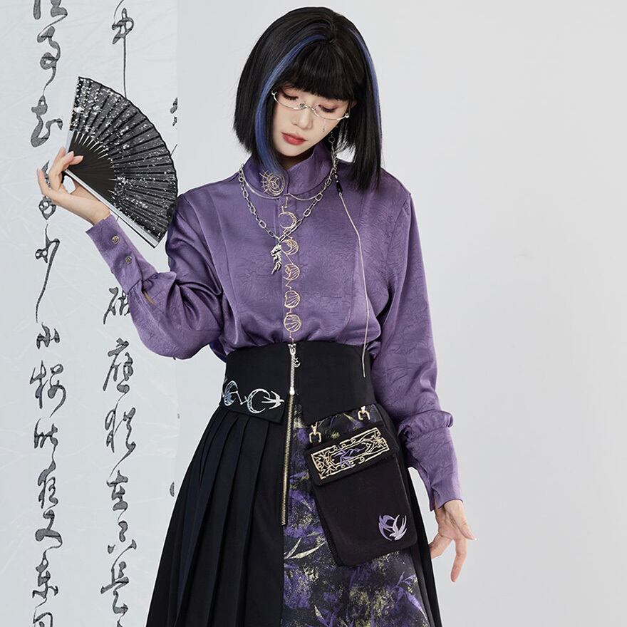 中華風の優雅な刺繍と、ジッパーの無機質な輝きの組み合わせが絶妙なバランスを生み出します。