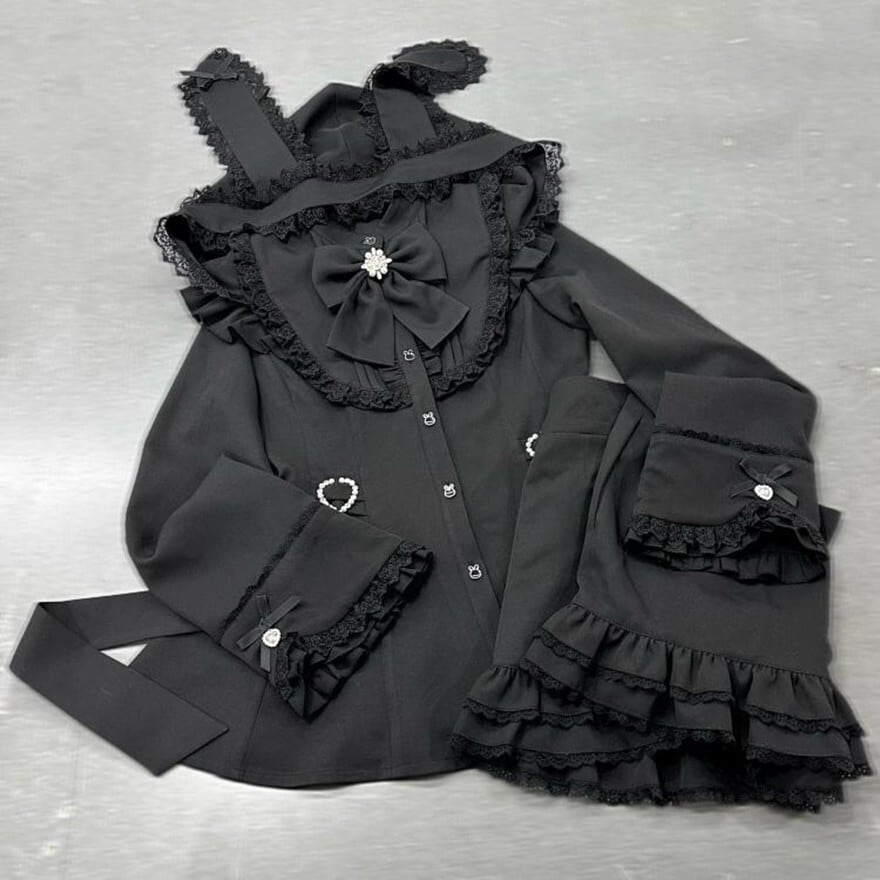シックな黒を基調としながらも、フリルやレース、そしてハートのディテールが華やかさと可愛らしさを演出するセットアップです。