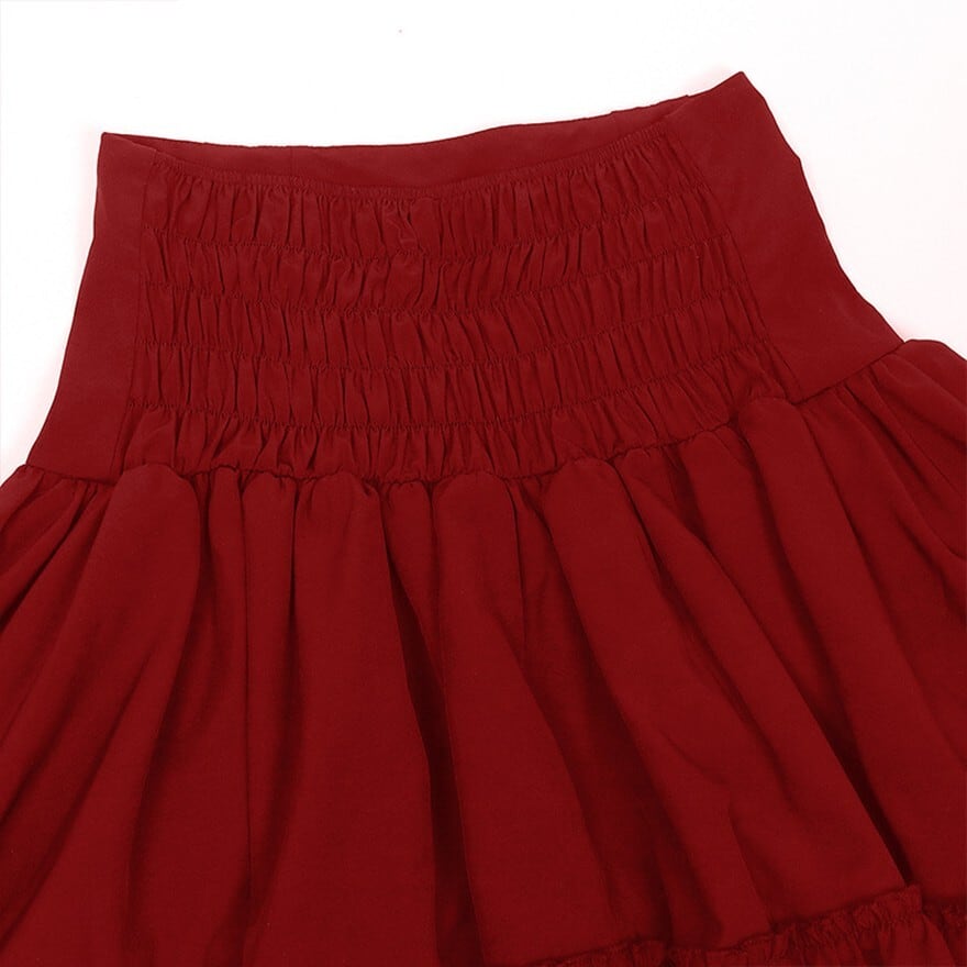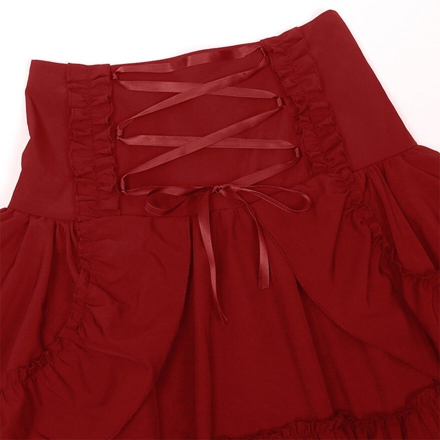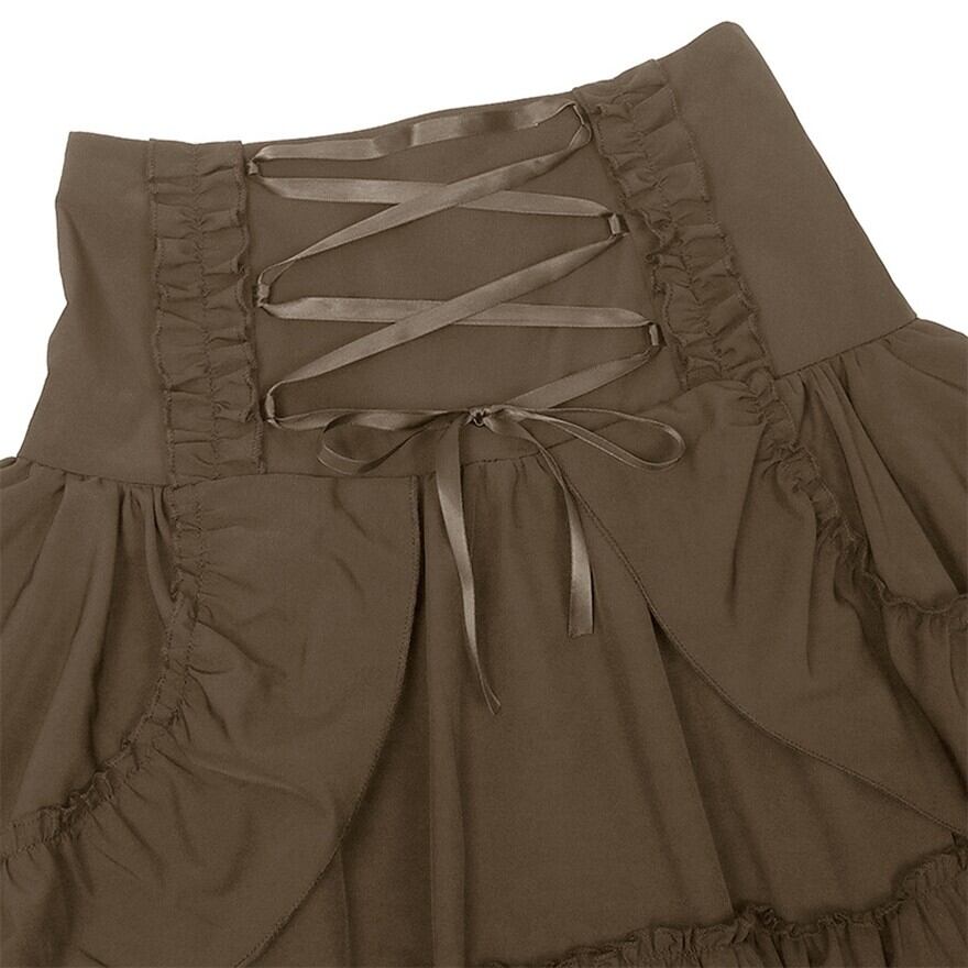 ハイウエストのウエスト部分は、フリルと編み上げが施されたコルセット風のデザインです。