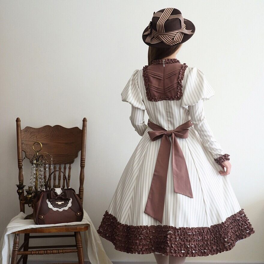 ストライプ柄の生地に、胸元の切り替えデザイン、そして袖口と裾にはたっぷりのフリルがあしらわれた、クラシカルロリータのワンピースです。