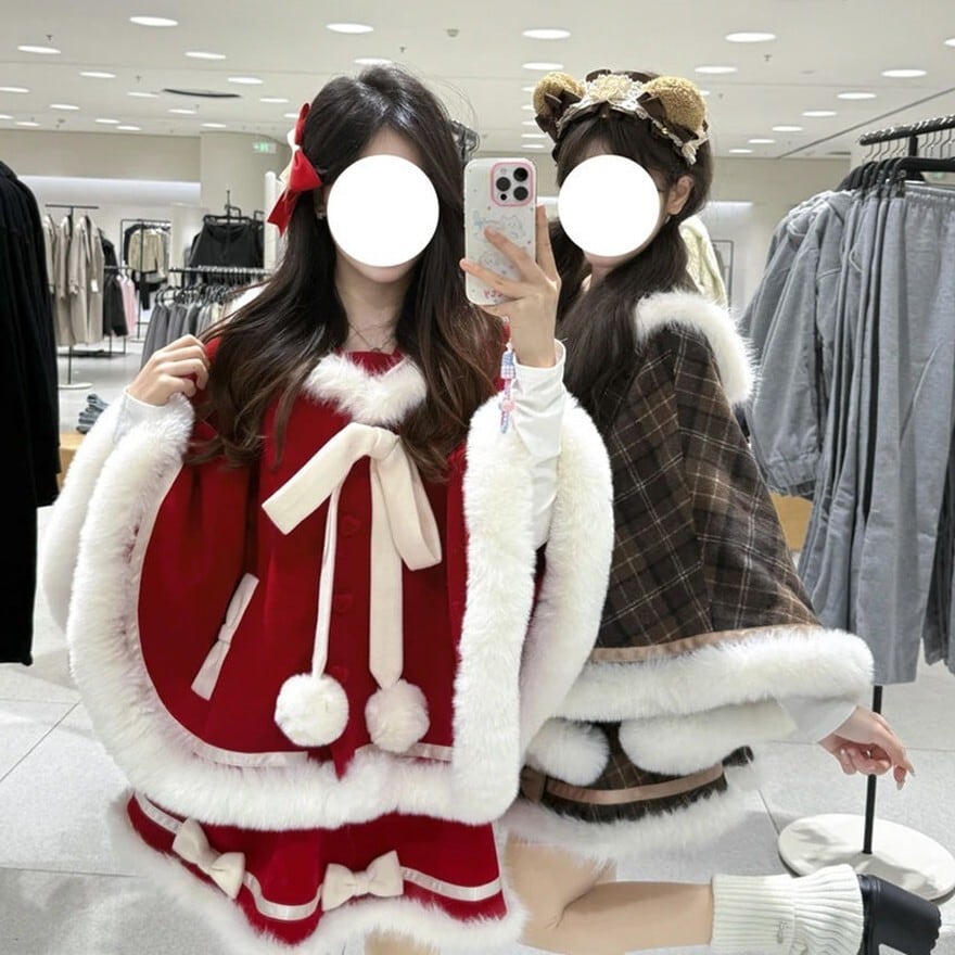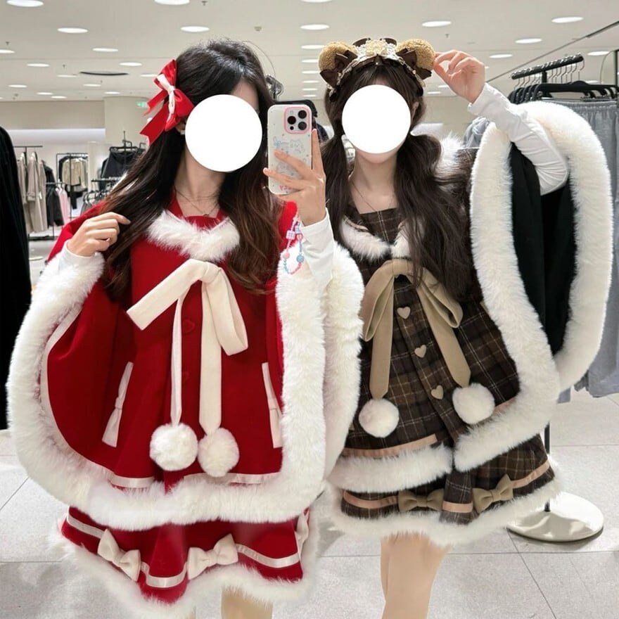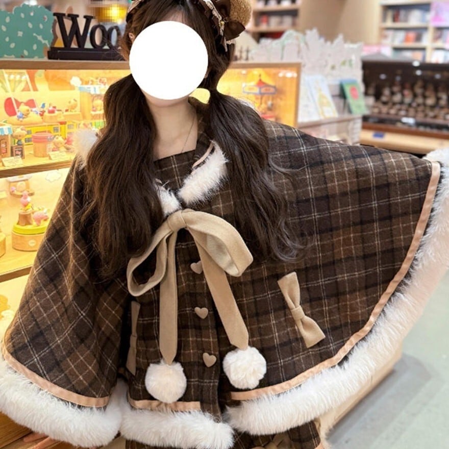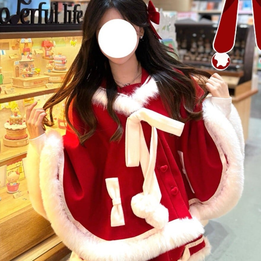 ケープは、ふわふわの白いファーが襟元、袖口、裾にあしらわれ、暖かく愛らしい印象を与えます。大きなリボンとポンポンが、さらにドーリーな雰囲気をプラス。丸みのあるシルエットが可愛らしさを引き立てます。