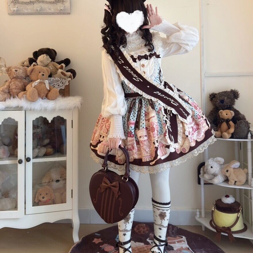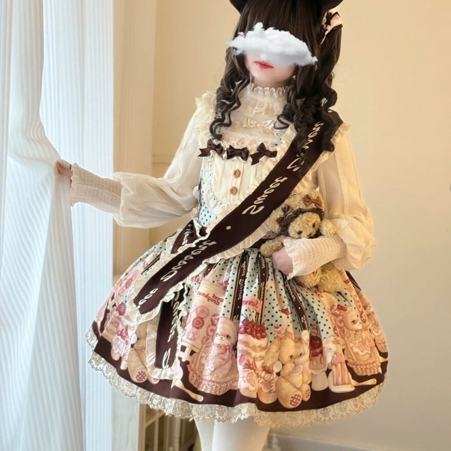 甘いお菓子とキュートなアニマルキャラクターが描かれた、とびきりスイートなロリータファッションを楽しめるセットです。