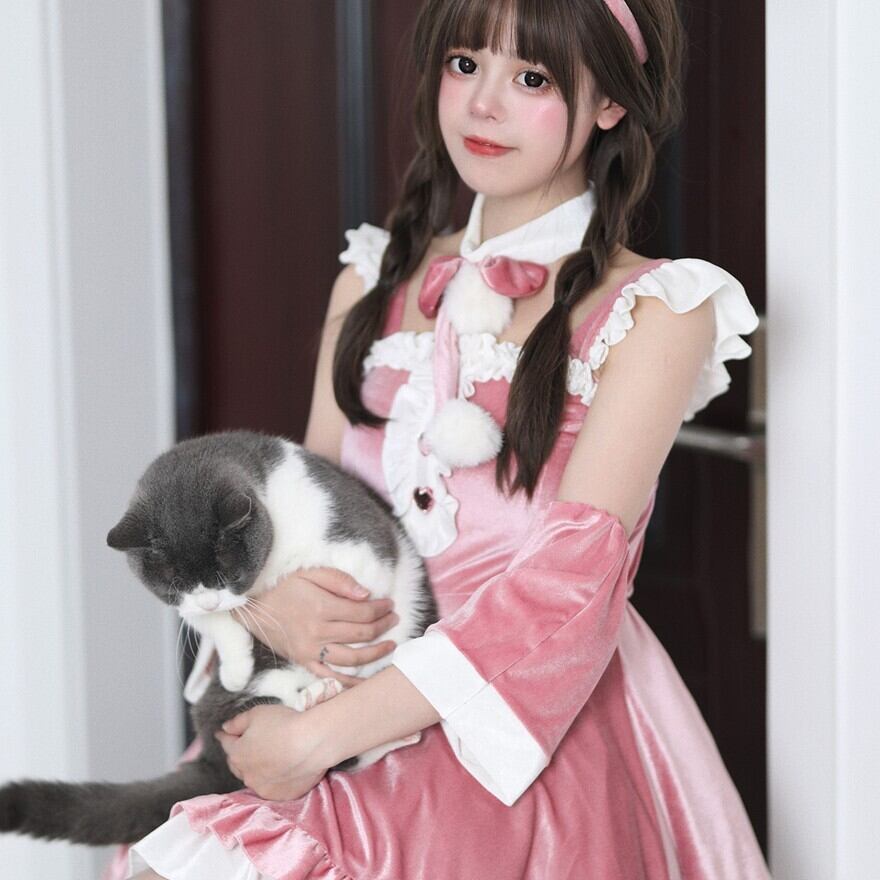 ベロア素材を基調とし、フワフワの白いファーやレースのフリルを贅沢にあしらった、華やかで愛らしい雰囲気のコスチュームです。