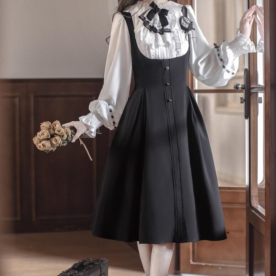 洗練されたジャンパースカート: ウエストから広がるタックが、歩くたびに優雅な動きを演出。広がりすぎないフレア感は、大人のクラロリスタイルにも最適です。