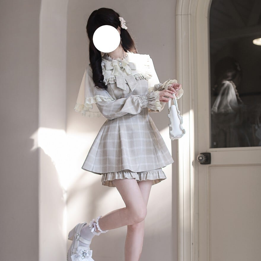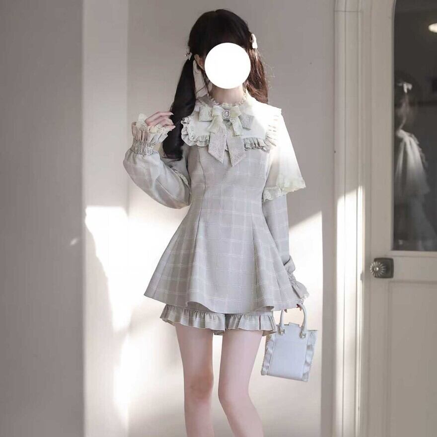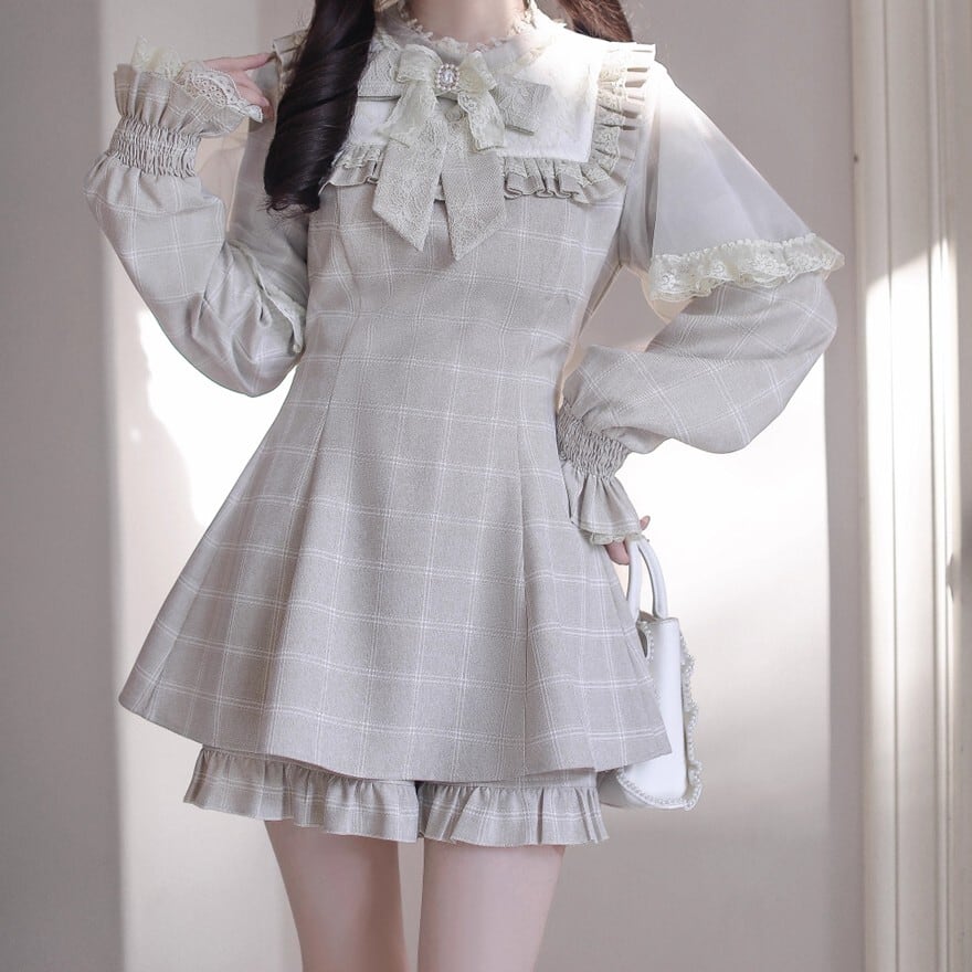 欲張りな3点セット: 繊細なレースをあしらったブラウス、美しいウエストラインを描くチェック柄トップス、そして裾からフリルが覗くショートパンツ。