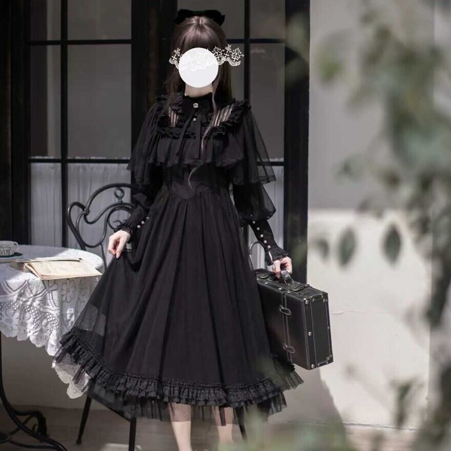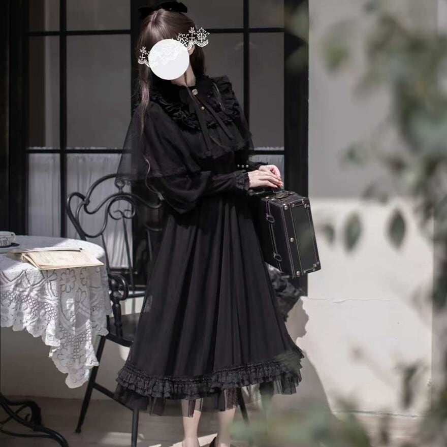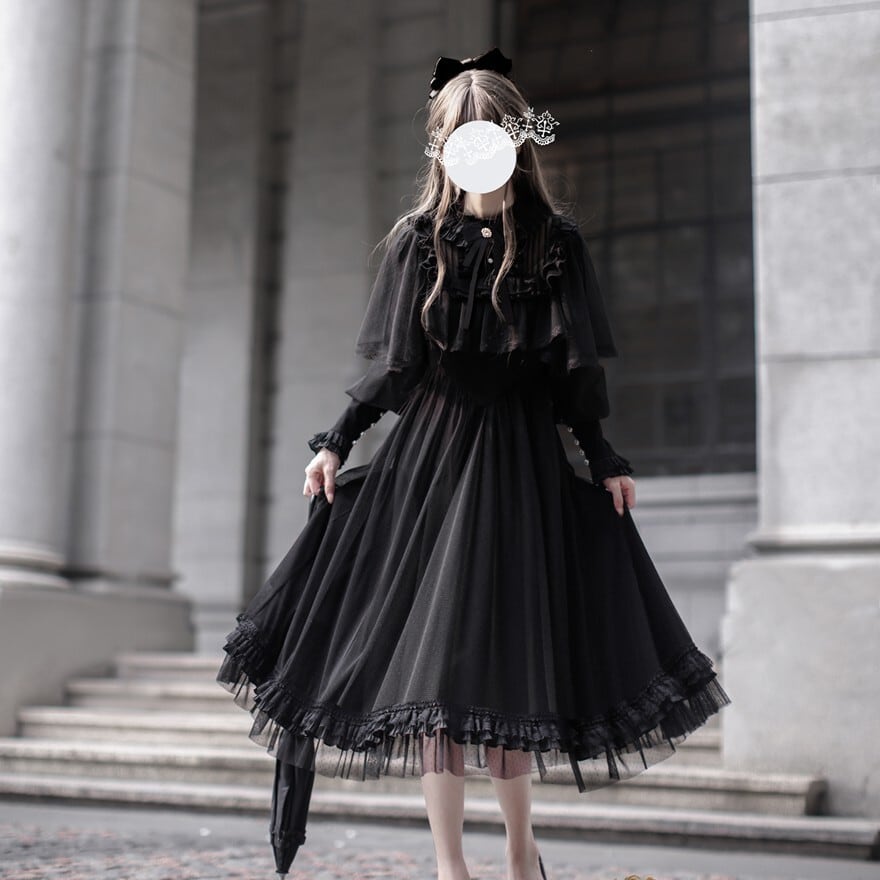「ブラックロリィタ」の王道を征く、深みのある黒を幾重にも重ねたドラマチックな一着です。
