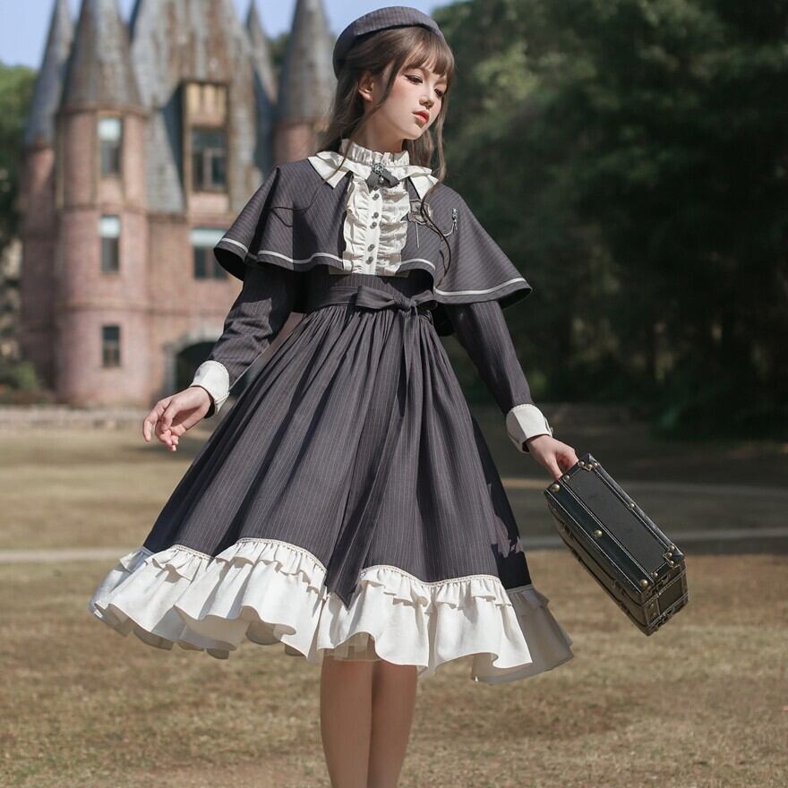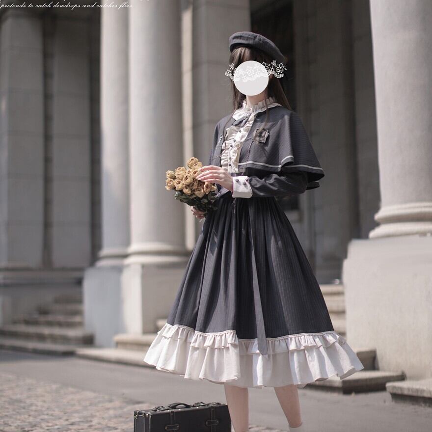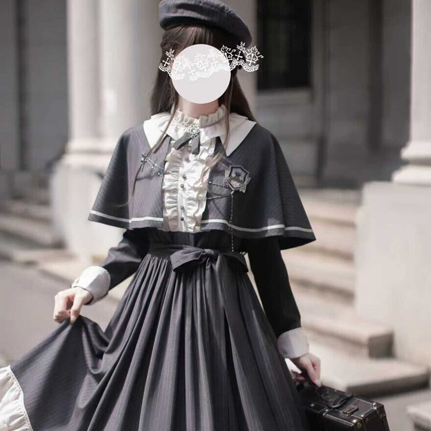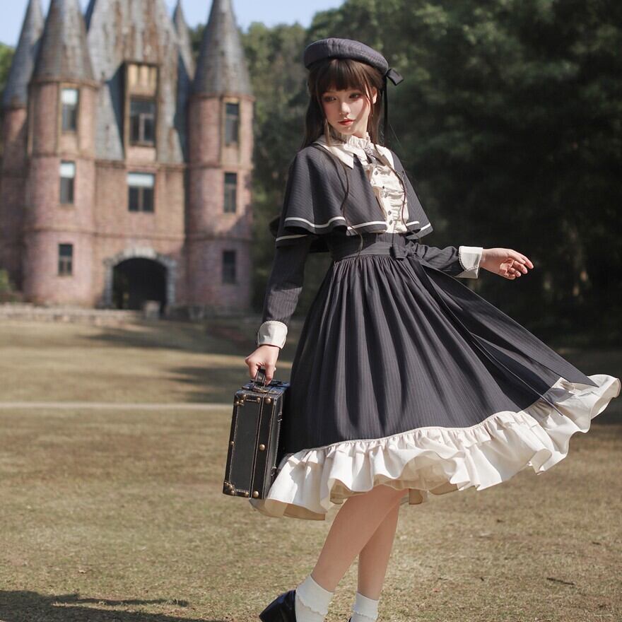 Alice style 量産型 クラシカルロリィタ セットアップ ケープ ワンピース 蝶ネクタイ付き ストライプ柄 女学園風 控えめ 胡桃木