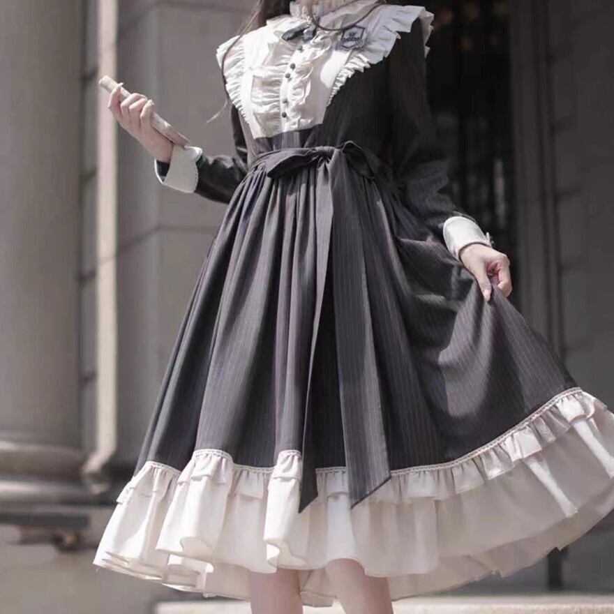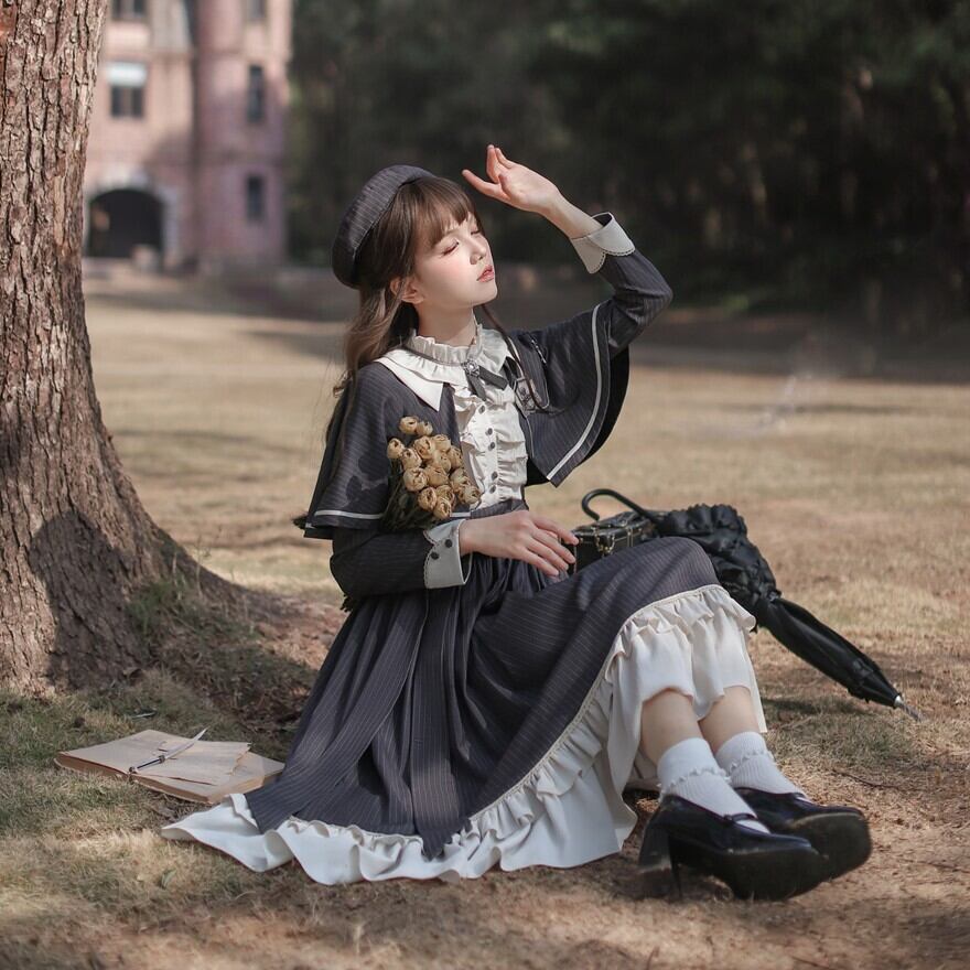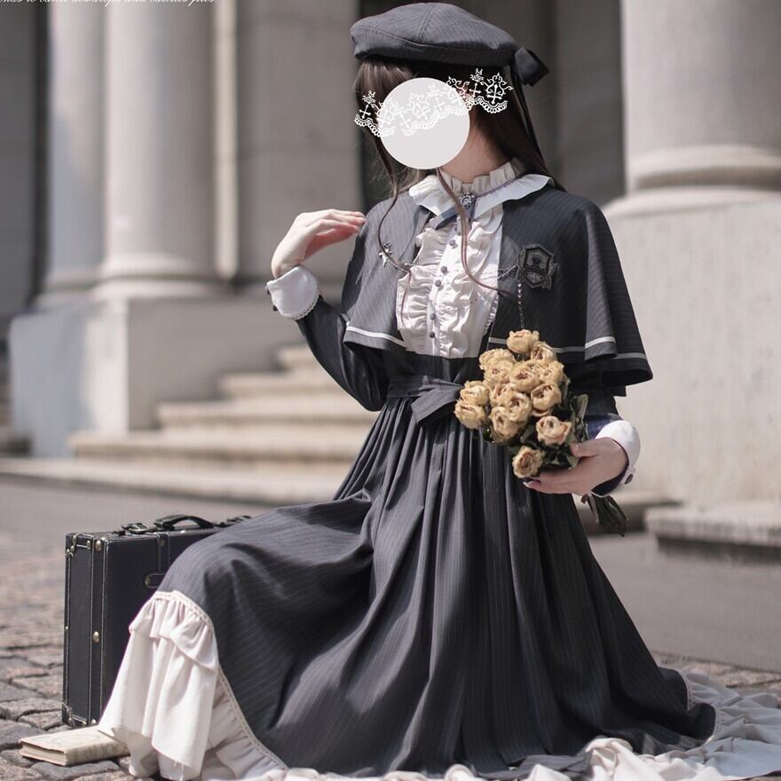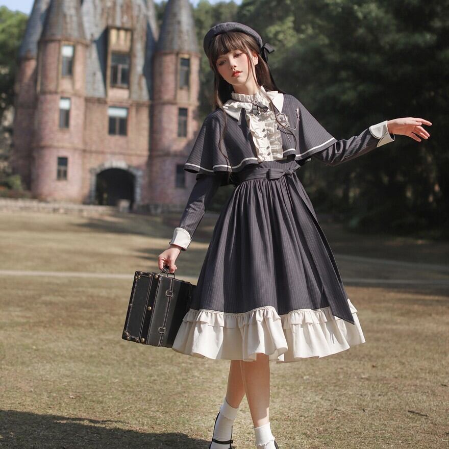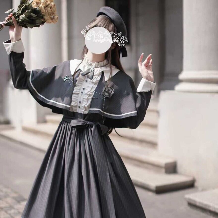 Alice style 量産型 クラシカルロリィタ セットアップ ケープ ワンピース 蝶ネクタイ付き ストライプ柄 女学園風 控えめ 胡桃木