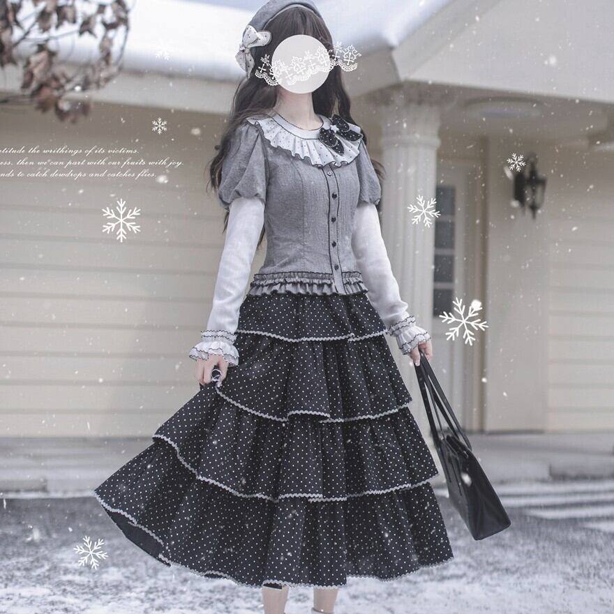 Alice style 森ガール風 水玉柄 ケーキスカート ミドル丈 パフスリーブ